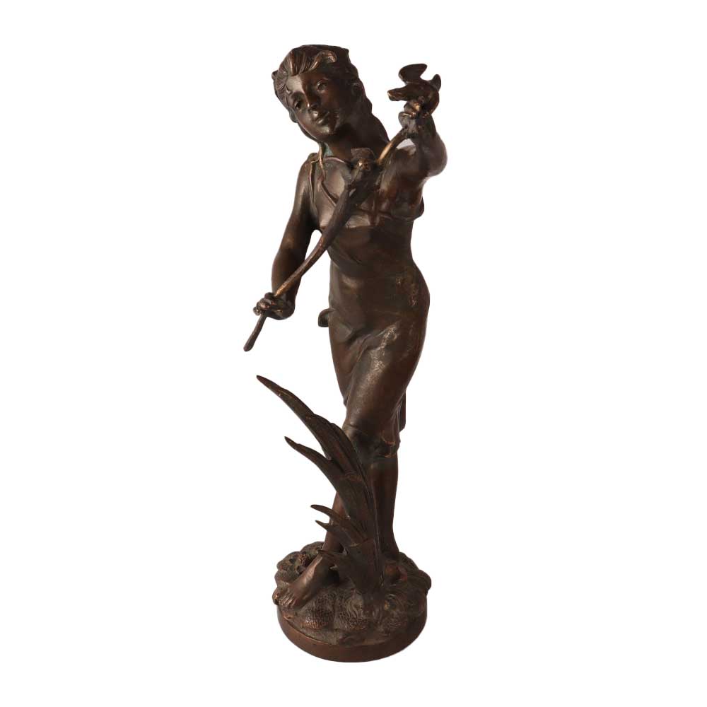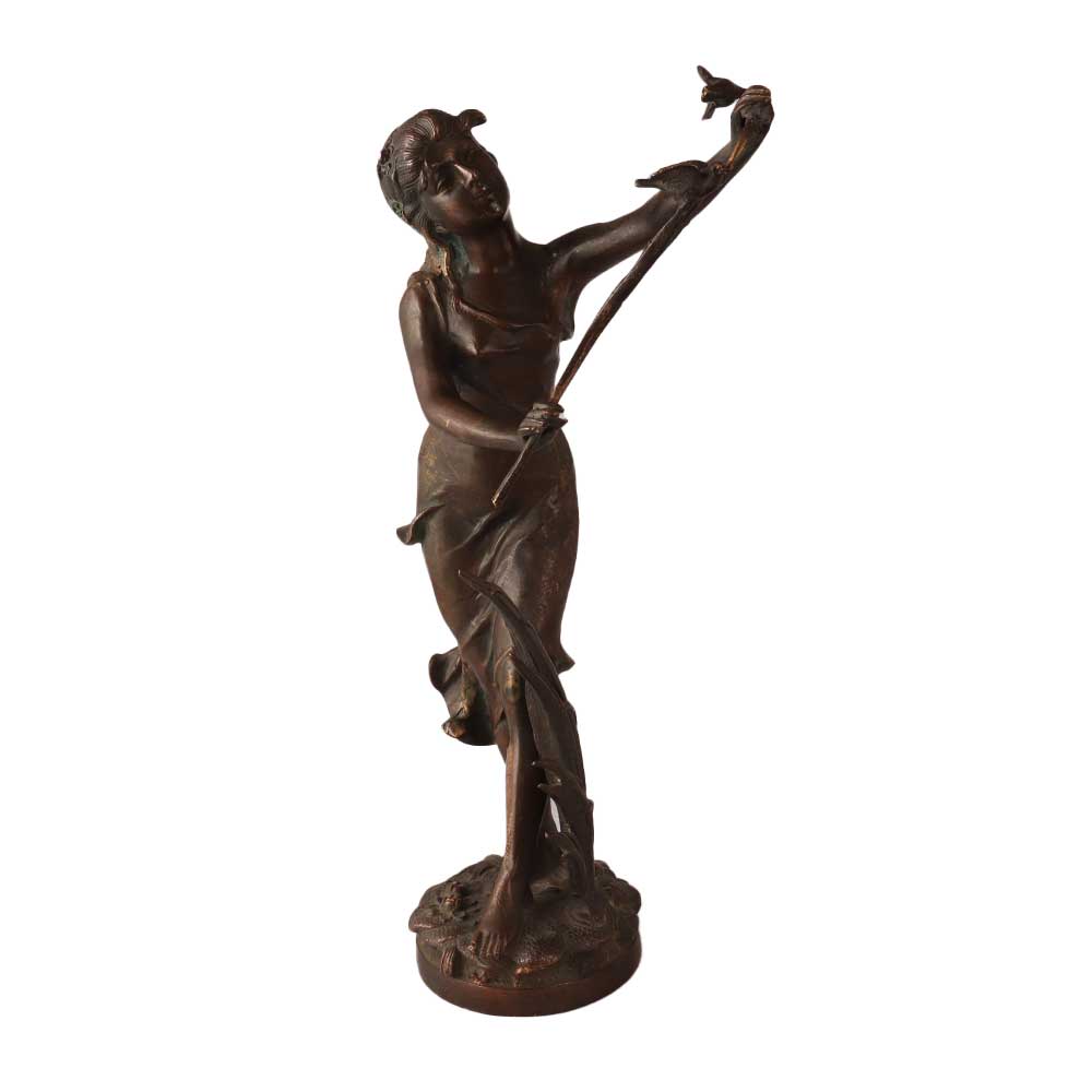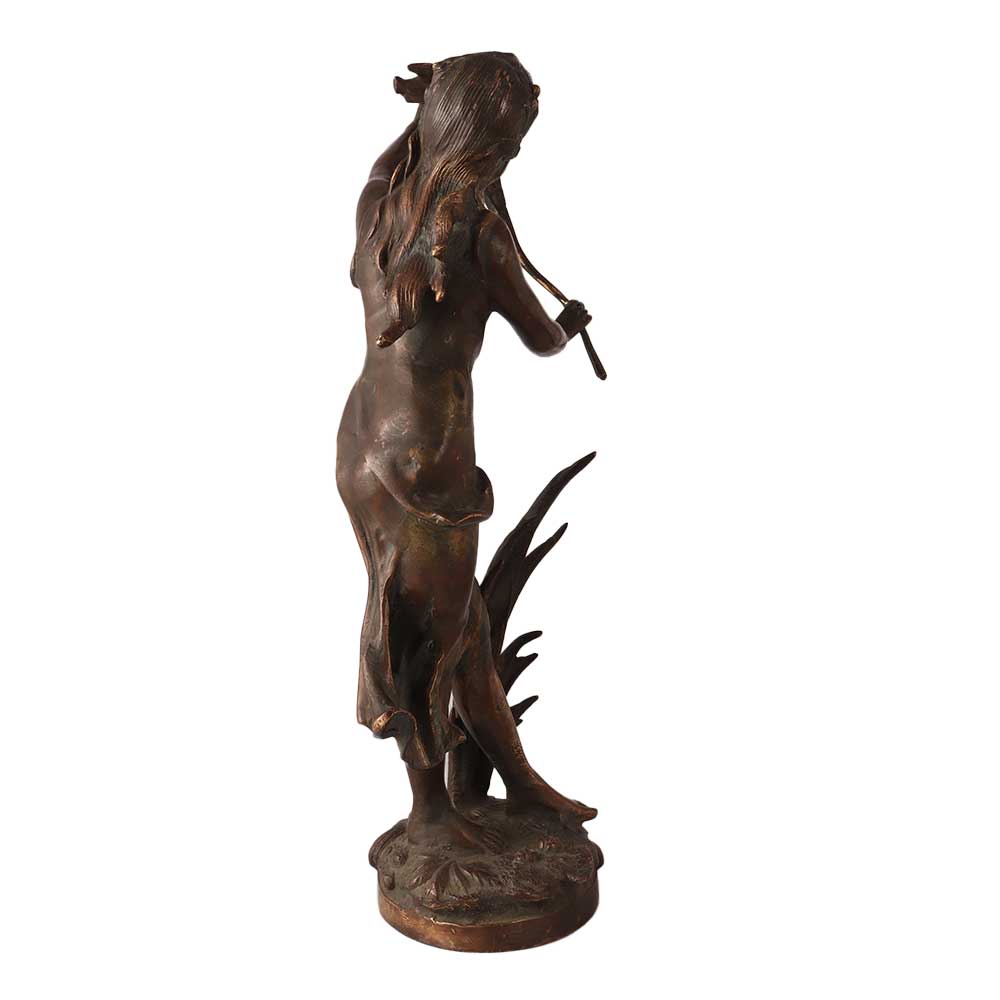 Handcrafted brass statue of women with stem of a flower blowing in wind is a statue that depicts a female figure holding a stem of a flower in her hand, with the wind blowing through her hair and dress. The metal statue's pose is graceful and elegant, with the wind giving the impression of movement and vitality. The stem of the flower in the statue's hand is a symbol of beauty and the fleeting nature of life. The statue or art sculptures are likely a representation of the female form in art and the celebration of the beauty of nature. The statue is likely to be placed in a public area, such as a park or garden, as a work of art to be appreciated by the community. It could be part of a sculpture garden or part of a larger installation. It could be a contemporary or modern statue.