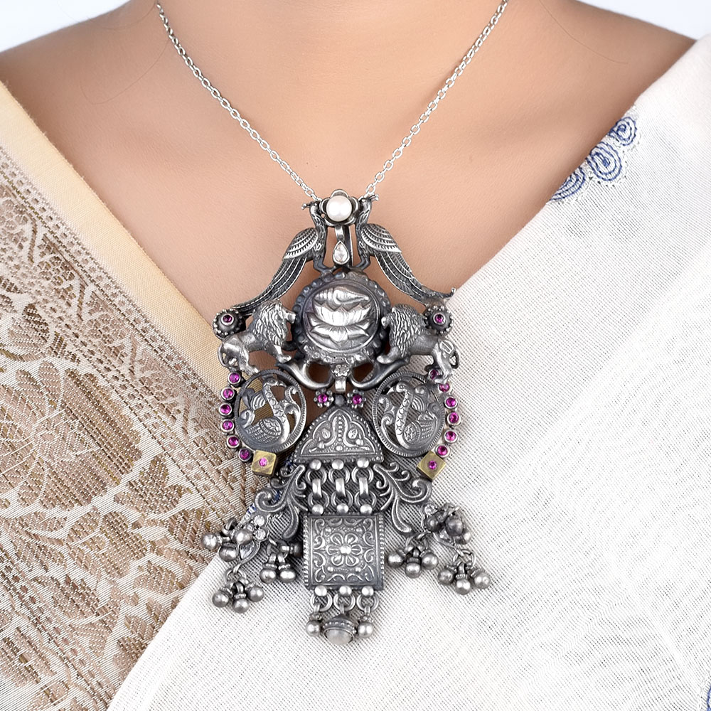 A gorgeous piece, with traditional motifs and stunning metalwork! This piece is sterling silver depicts Lions, Peacocks and Ducks surrounded by flowers and an ornate vine motif Lotus flower in the centre. Size for a man or women, this antique pendant is sure to make a great addition to one's wardrobe.