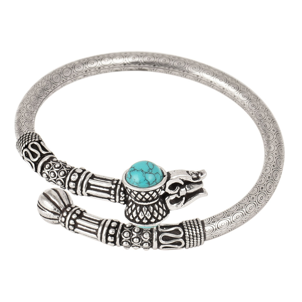 Trishul bangle made in pure 92.5 sterling silver has intricate work with turquoise stone situated inside a dumroo, leading into a Trishul .This Handmade silver bangle can be matched with traditional as well sasual apparels and can be worn to parties, weddings and other auspicious occasions.