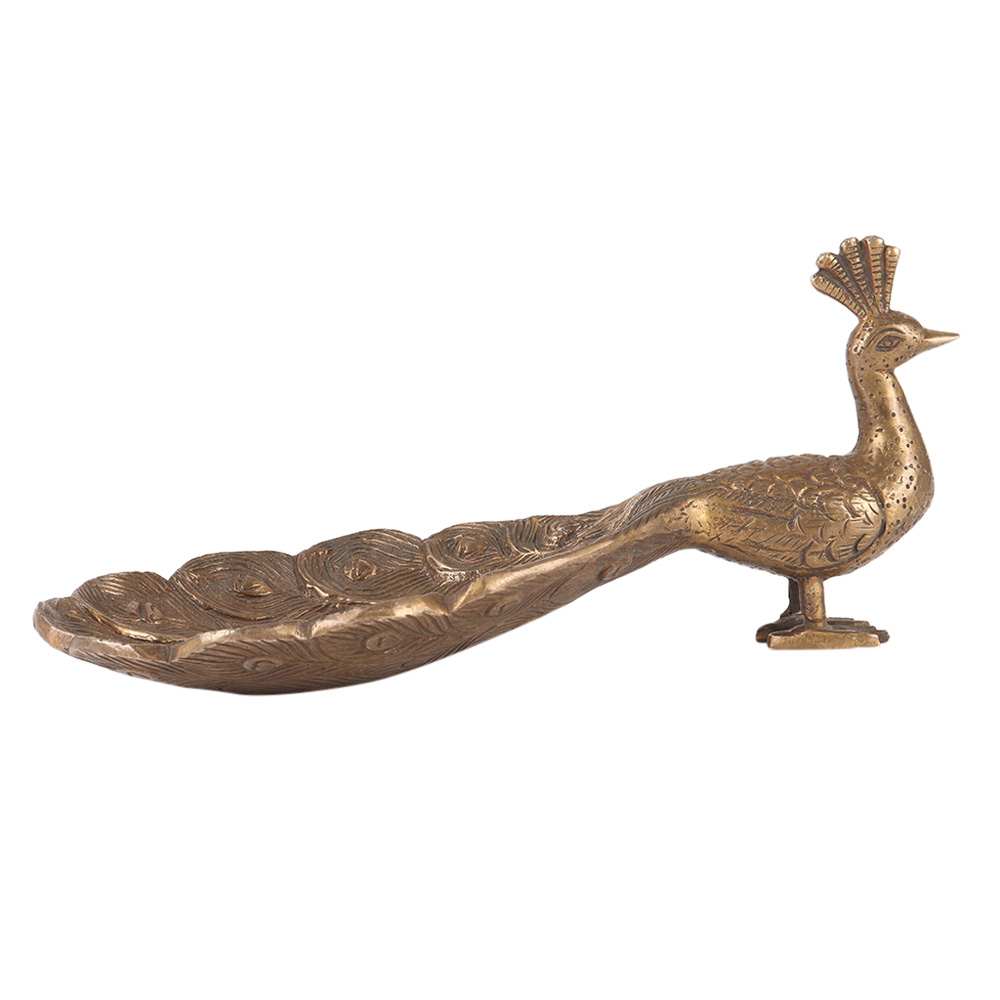 Brass Peacock feathers cascade into a fluffy fan to capture all of your treasures. This one-of-a-kind tray combines 70's glitz with current materials used to create a timeless addition to your foyer, bedside table, or washroom countertop. It comes with an antique golden finish.