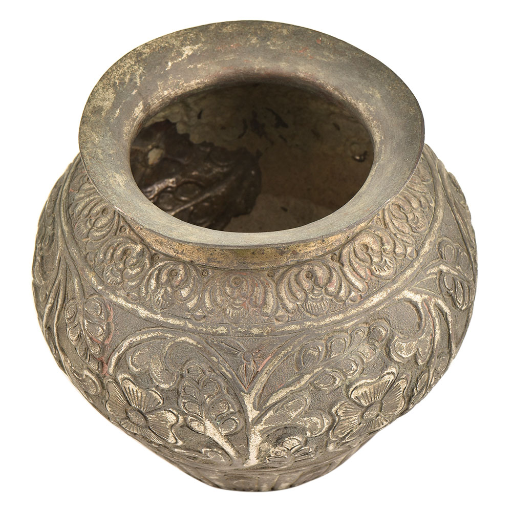 A magnificent handmade brass vessel or lota is heavily decorated with a very elaborate foliate design in unusually high relief. The pot has arches with a leaf design depicted in the centre. The neck is slightly bent at one side . Use it as a home décor product or a flower vase.