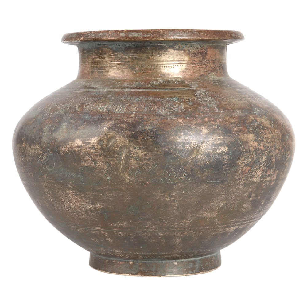 This heavy holy water pot or Kalash was handmade by skilled Indian workers using ancient techniques. It was carved from a brass metal alloy. It has an antique finish and comes with a stand at the bottom to hold it on the surface. The Kalash has a long history in Hindu rituals. They were used to hold Gangajal (holy water from the river Ganga) or sacred water. Kalash are also used in Hindu temples to offer water to the Shivling. Beautify your home by placing this ancient water pot on your table or shelf.