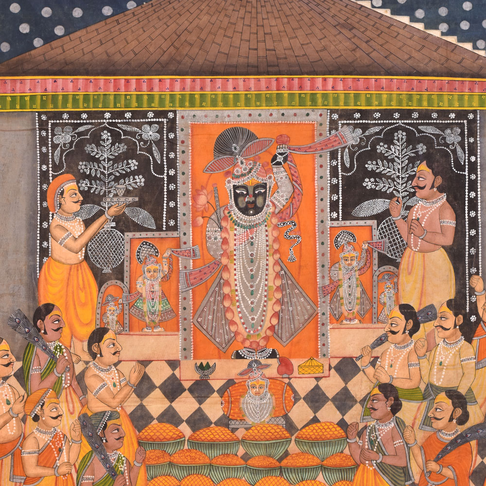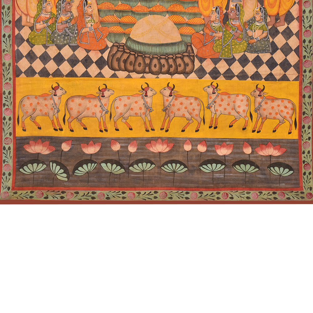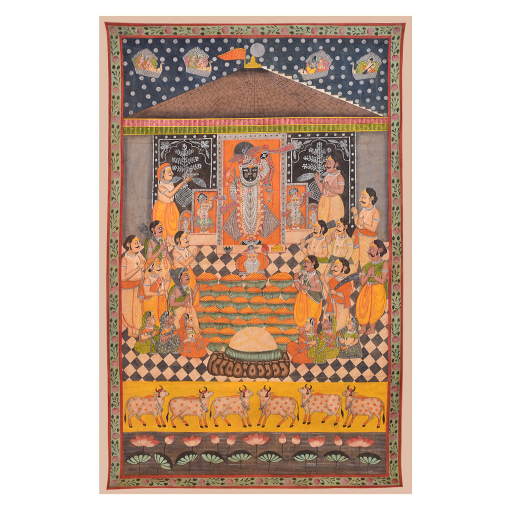 This beautiful pichwai painting on fabric cloth is an intricate work of art that depicts a Hindu God temple, surrounded by many devotees praying to the deity. The painting is created using multi-coloured hues and has been painted by professional Indian artists, making it a stunning masterpiece of craftsmanship. In the background, we can see four swan vehicles in the sky, and six cows which represent the holy and nurturing aspect of the mother goddess. The lower portion of the painting has been decorated with beautiful flowers that add to the aesthetic value of the artwork. This pichwai painting would make an excellent addition to your prayer room or temple, creating a peaceful and serene atmosphere. It can also be given as a gift to family, friends, or relatives for special or festive occasions such as weddings, housewarmings, or religious ceremonies. It is not just a piece of art, but a representation of the divine that can bring joy, peace, and blessings into your home.
