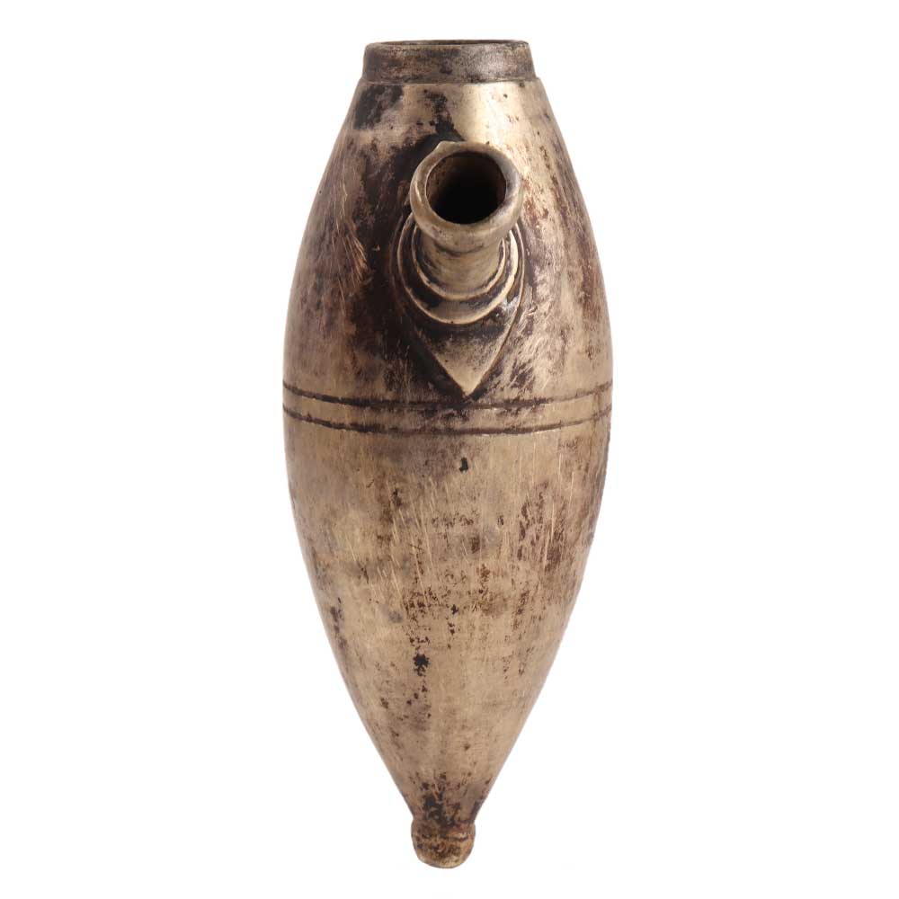 Northern India's antique Mughal Indian Islamic cast bronze Hookah base. This oval-shaped Hookah features a top aperture and a spout on the upper front belly. The specific shape and sizes were created for different choice and taste of the elite class. It has an artistically engraved motif mostly on its midsection. The exposed areas are worn out from centuries of use.