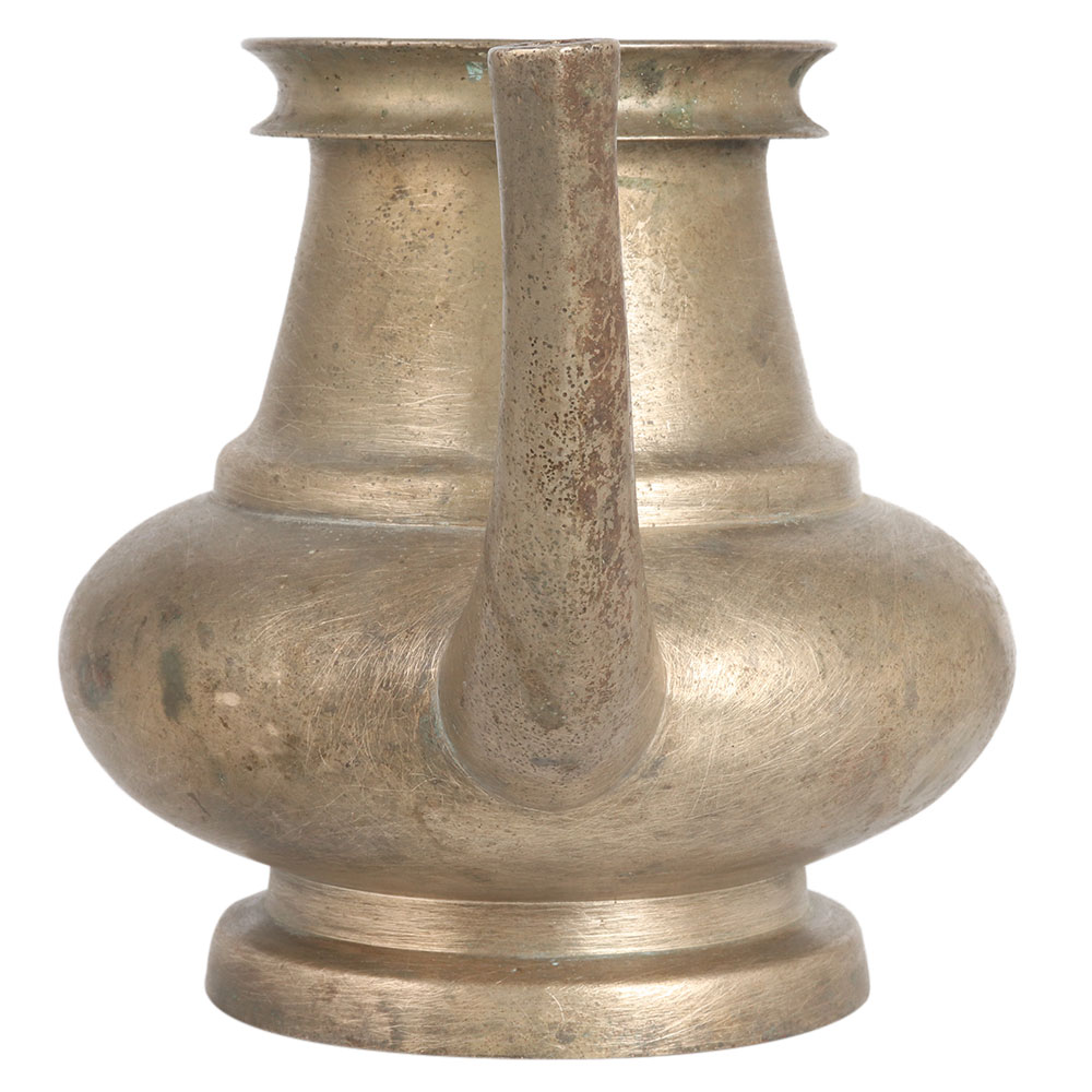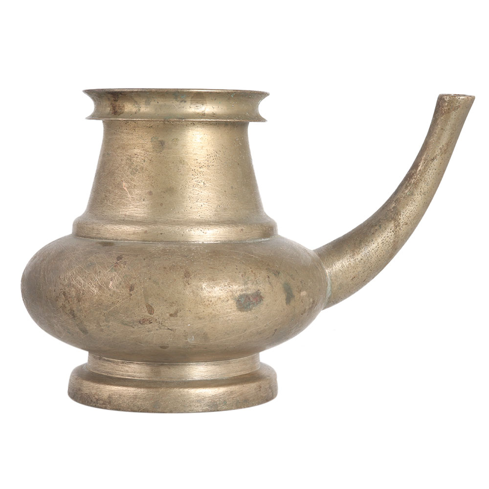 A vintage brass Kindi or water pot in South Indian art. A Kindi is a pitcher or water pot commonly called Kindi in the South Indian state of Kerala in homes for puja to dispense holy water. It is usually kept at the entrance of a house for guests to wash their feet or hands. It is designed in such way so that hands never touch the water in the Kindi during use, so the water is not contaminated. Gift it on special occasions to your loved ones.