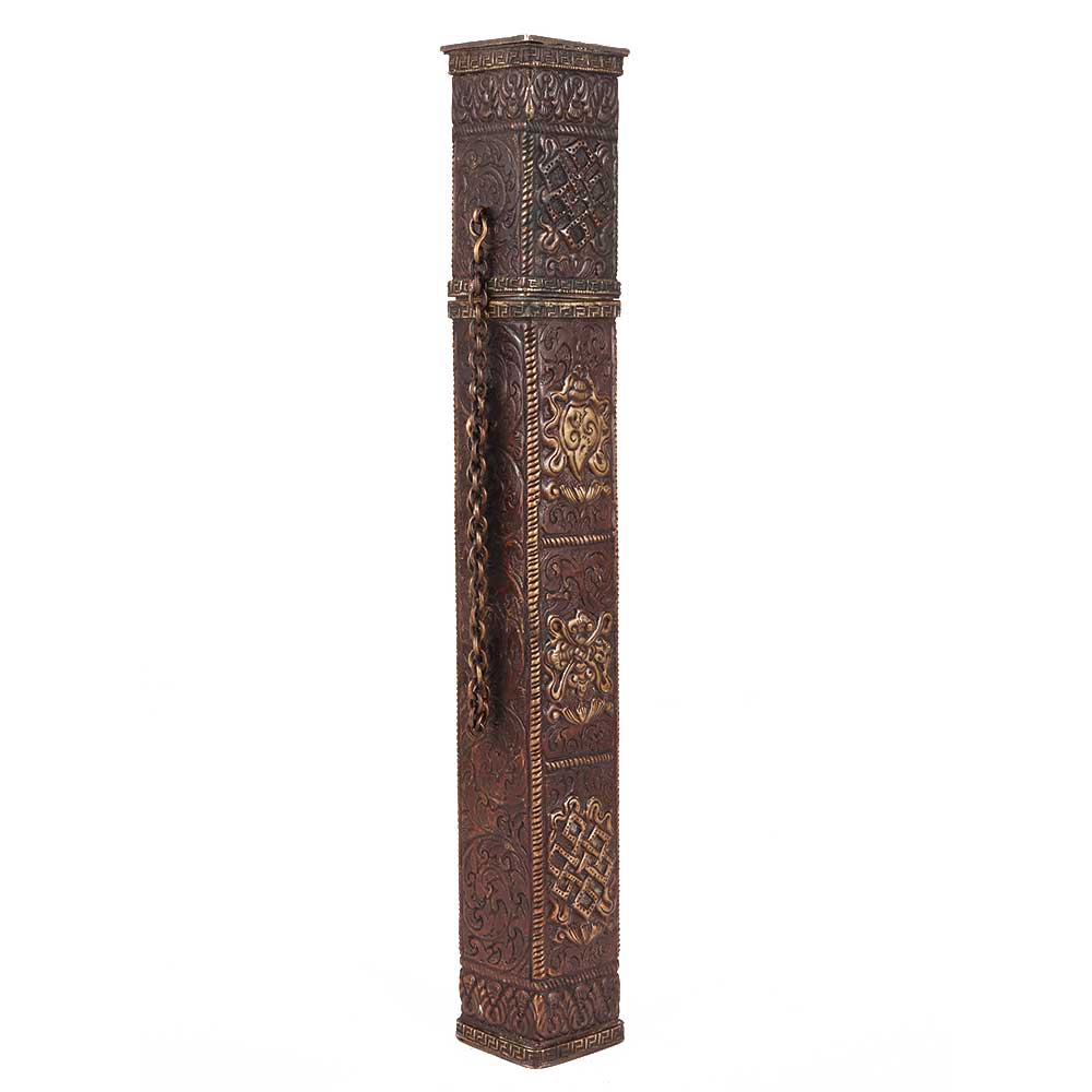 Handcrafted from tarnished copper with brass accents this old Tibetan Incense Burner  has a deep patina that highlights the brass motifs and Tibetan calligraphy. Monks and travelling priests utilised these cases extensively across Tibet and Nepal. The lid fits snugly, however the original thread or "safety" chain that kept the lid from falling off is missing.