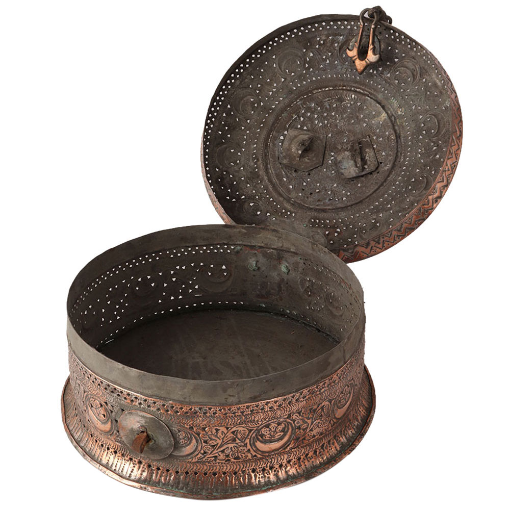 The traditional jewelry box was used to store jewelry and other valuable items. It is made of copper and has a handle on the top to hold it. It has a beautiful jali work with floral patterns on it. Use it to display or store your jewelry in the box.