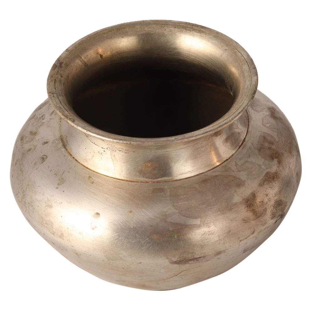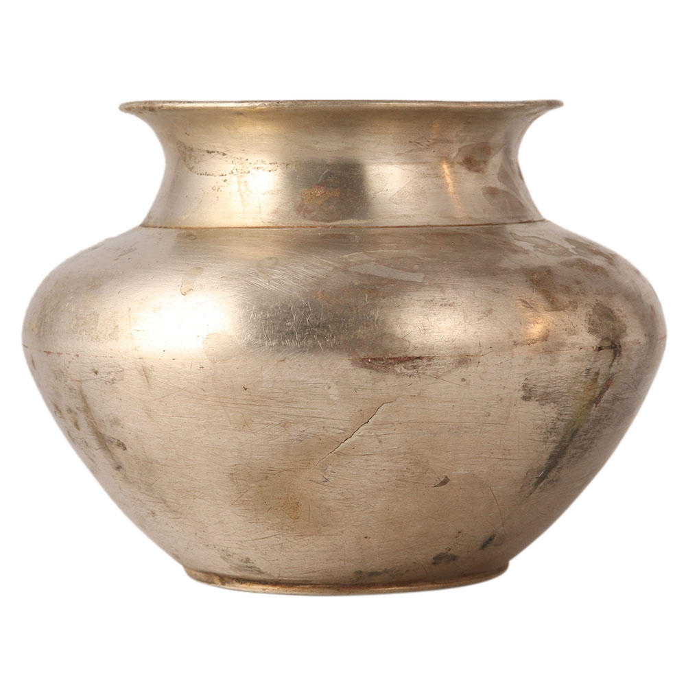 This traditionally handmade lota or water pot has a small mouth with a large belly for storing holy water, coins, gems, etc. It is made of white metal alloy. It is a perfect decoration item for your business, home, office or stage.