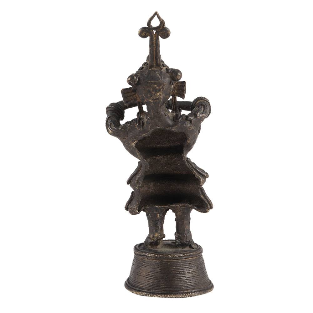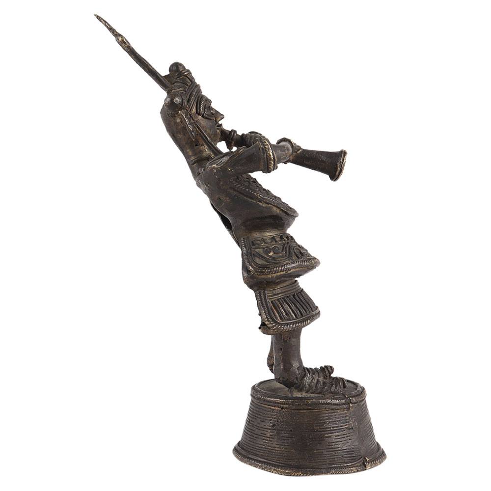 Indian brass tribal Ganesh musician statue handcrafted in India. It's made of thick brass with intricate craftsmanship and has a lovely patina from period. A flute-like instrument is held by the Ganesh statue. He wears an elaborately decorated costume and a large headdress.