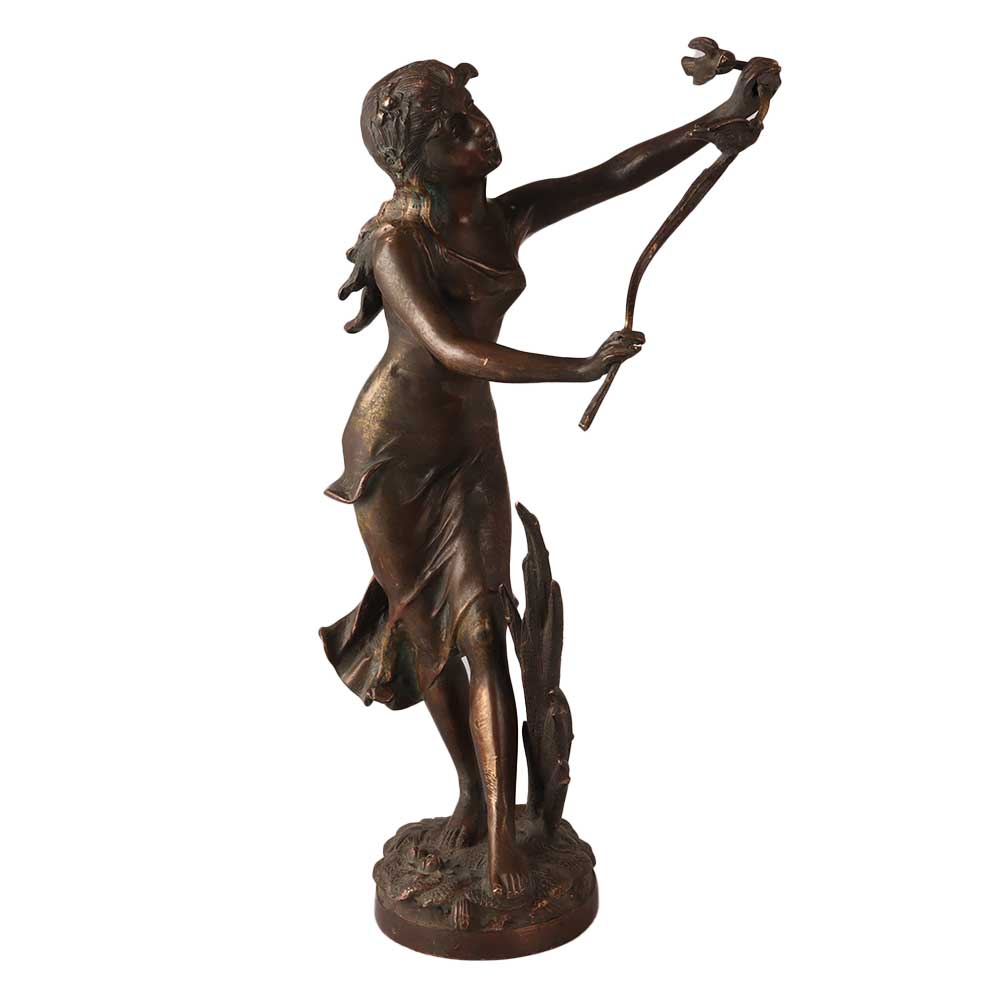 Handcrafted brass statue of women with stem of a flower blowing in wind is a statue that depicts a female figure holding a stem of a flower in her hand, with the wind blowing through her hair and dress. The metal statue's pose is graceful and elegant, with the wind giving the impression of movement and vitality. The stem of the flower in the statue's hand is a symbol of beauty and the fleeting nature of life. The statue or art sculptures are likely a representation of the female form in art and the celebration of the beauty of nature. The statue is likely to be placed in a public area, such as a park or garden, as a work of art to be appreciated by the community. It could be part of a sculpture garden or part of a larger installation. It could be a contemporary or modern statue.