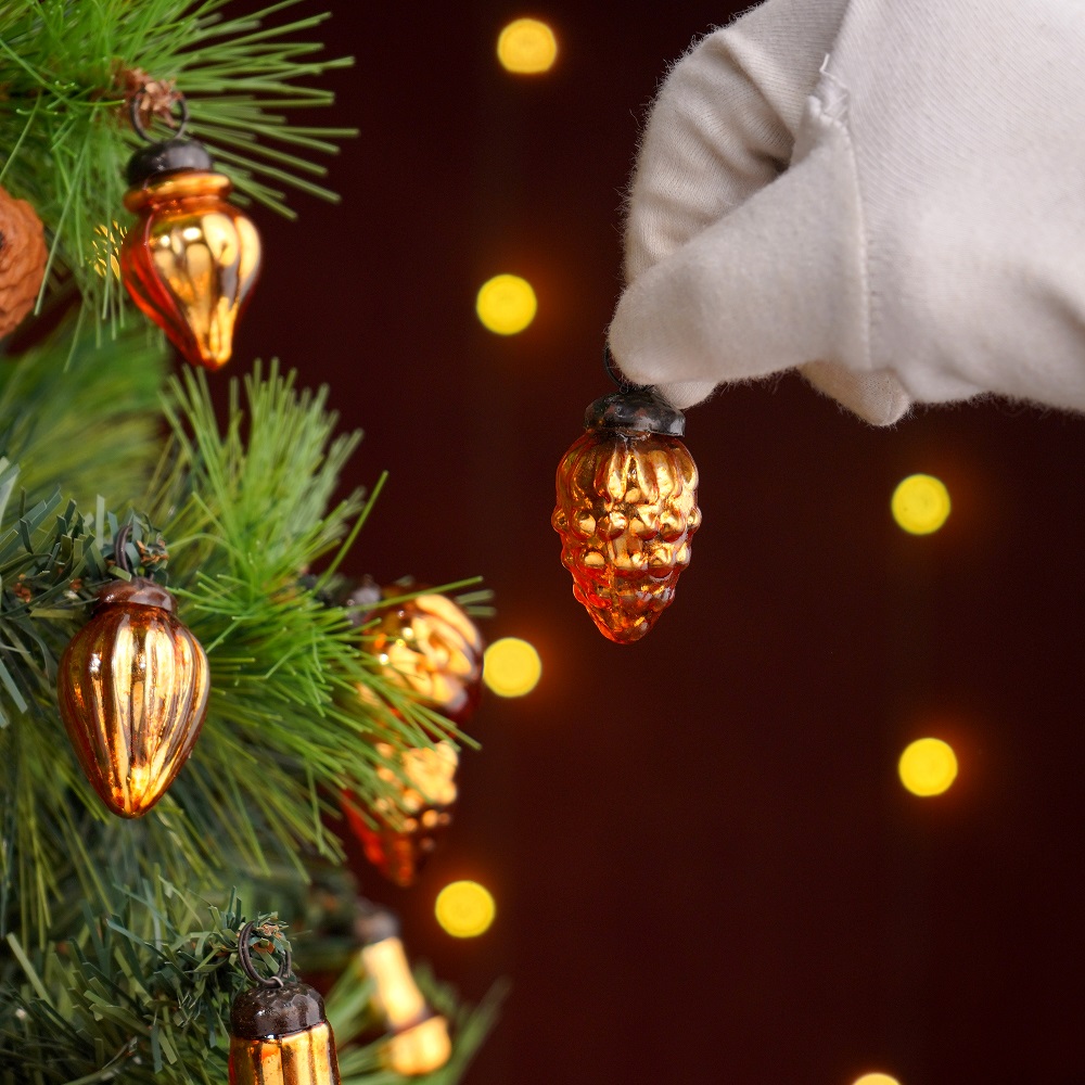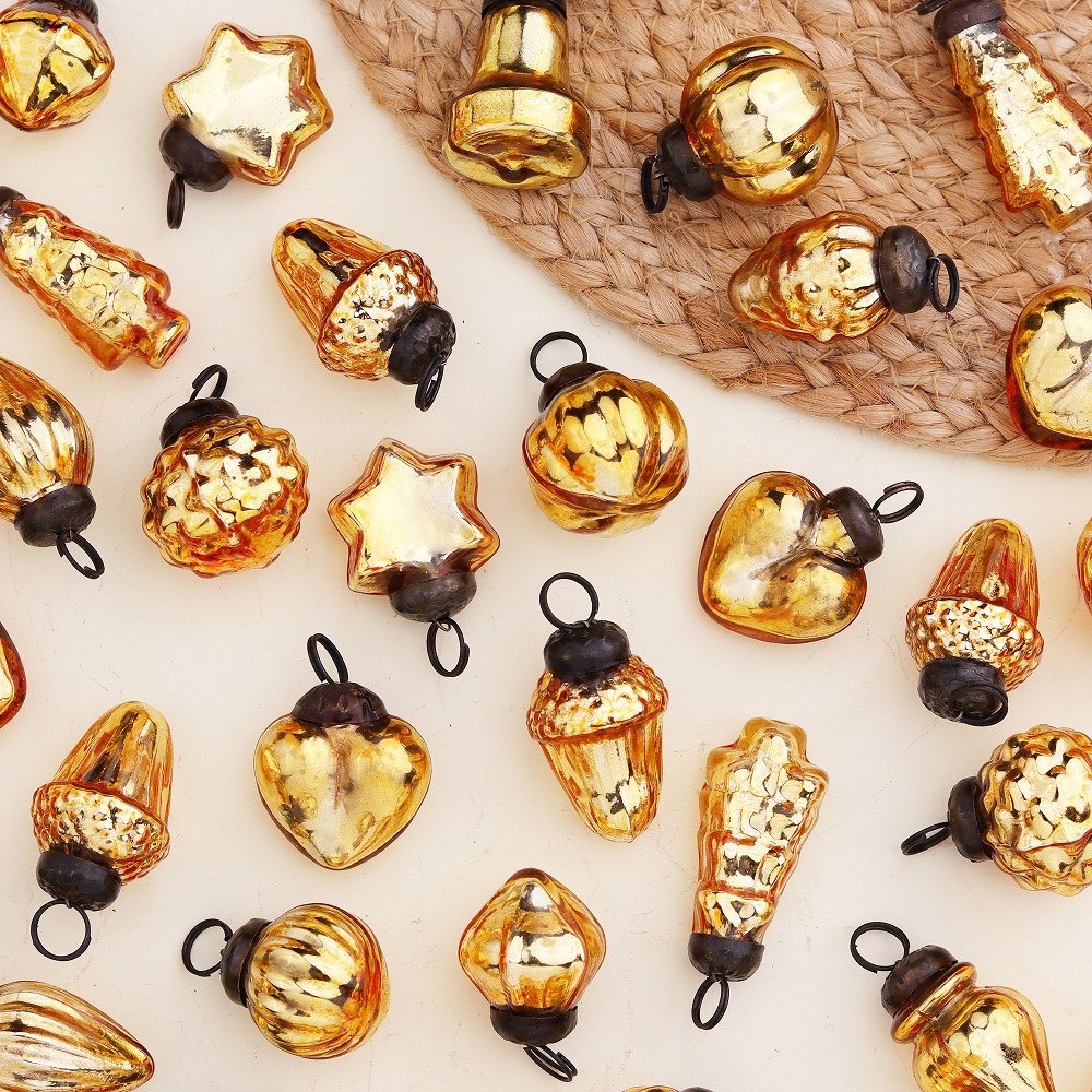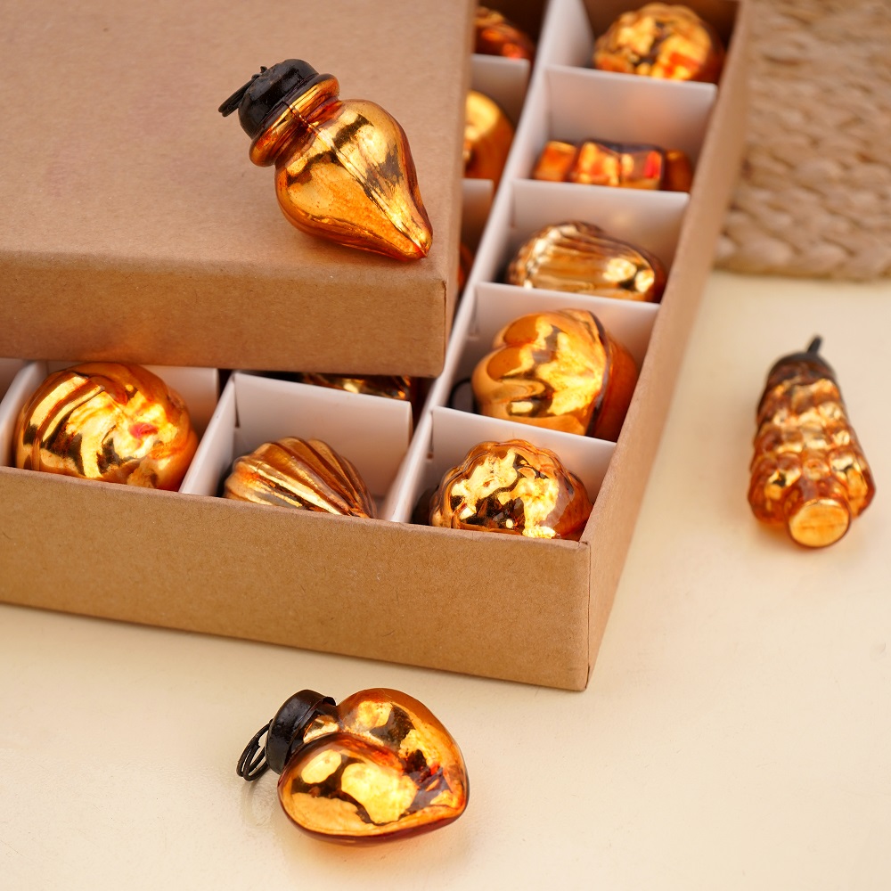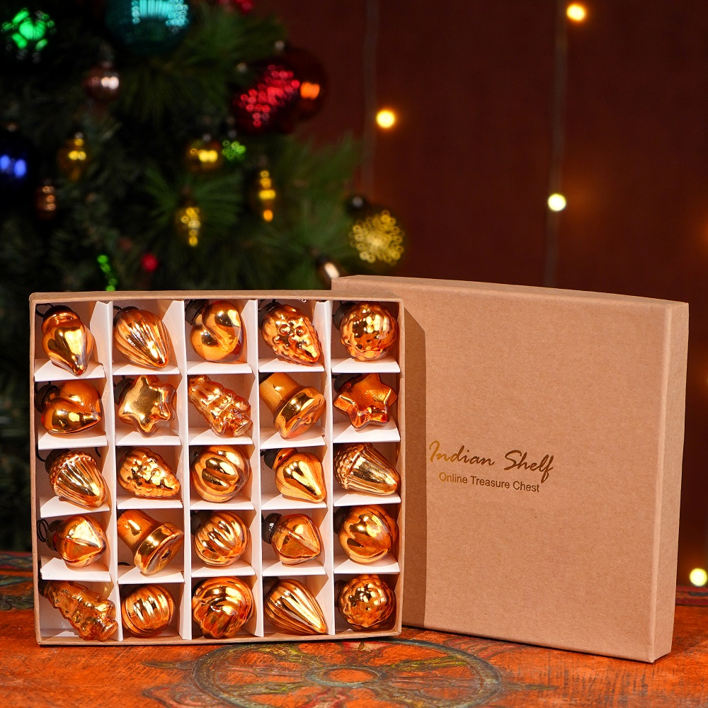 Buy a set of 25 Amber glass Christmas ornaments which are unique and handcrafted masterpiece. Crafted by highly skilled Indian artisans, these ornaments are a celebration of craftsmanship, tradition, and elegance. These stunning ornaments come in a variety of shapes, from classic spheres to intricate designs, ensuring a diverse and captivating display on your Christmas tree. The lush green and gleaming golden colours blend harmoniously, adding a touch of opulence to your holiday decorations. Versatile and enchanting, these ornaments aren't just limited to Christmas. They make a delightful addition to weddings, bridal showers, and other special occasions, elevating the ambiance with their radiant charm. Hang them in your home or garden to infuse every space with a touch of festive cheer. These handcrafted treasures also make for exceptional gifts. Share the joy and craftsmanship with your loved ones on special or festive occasions, leaving a lasting impression of your thoughtfulness and appreciation for beauty..