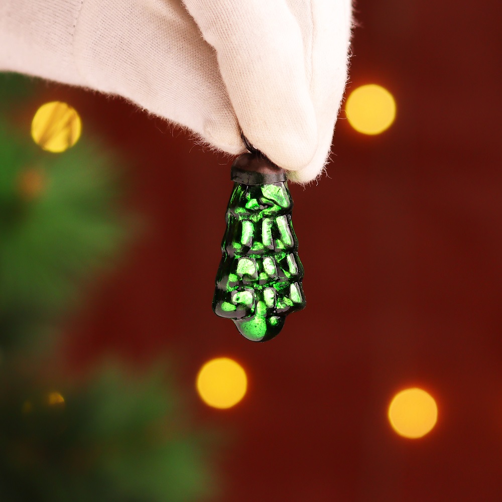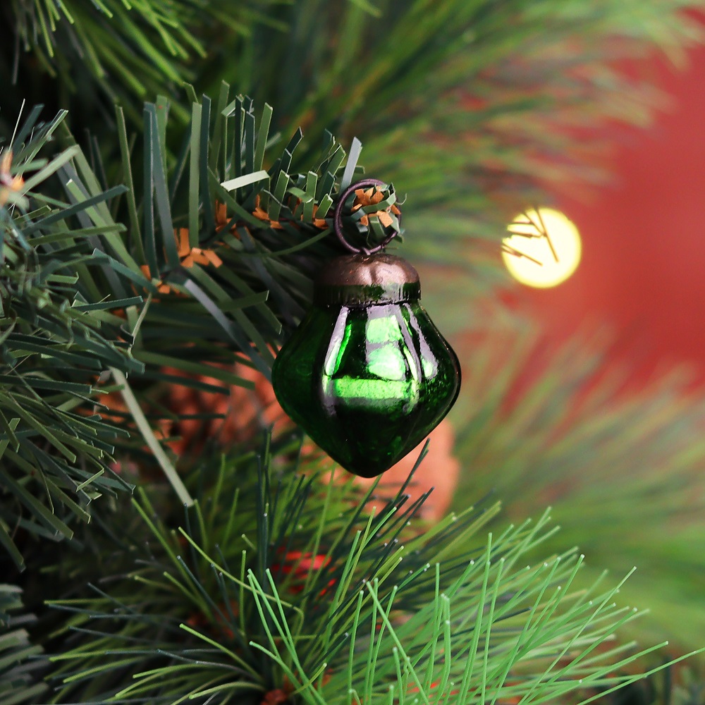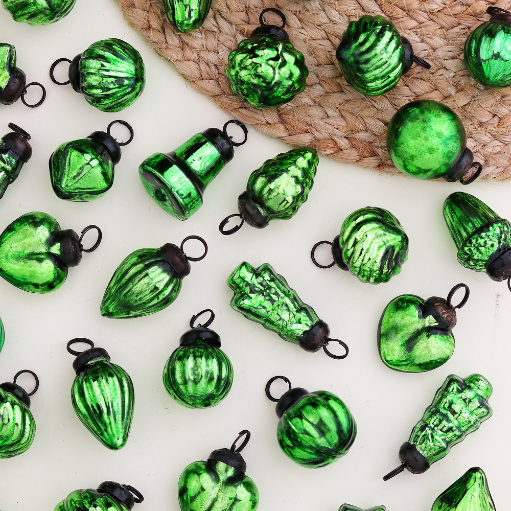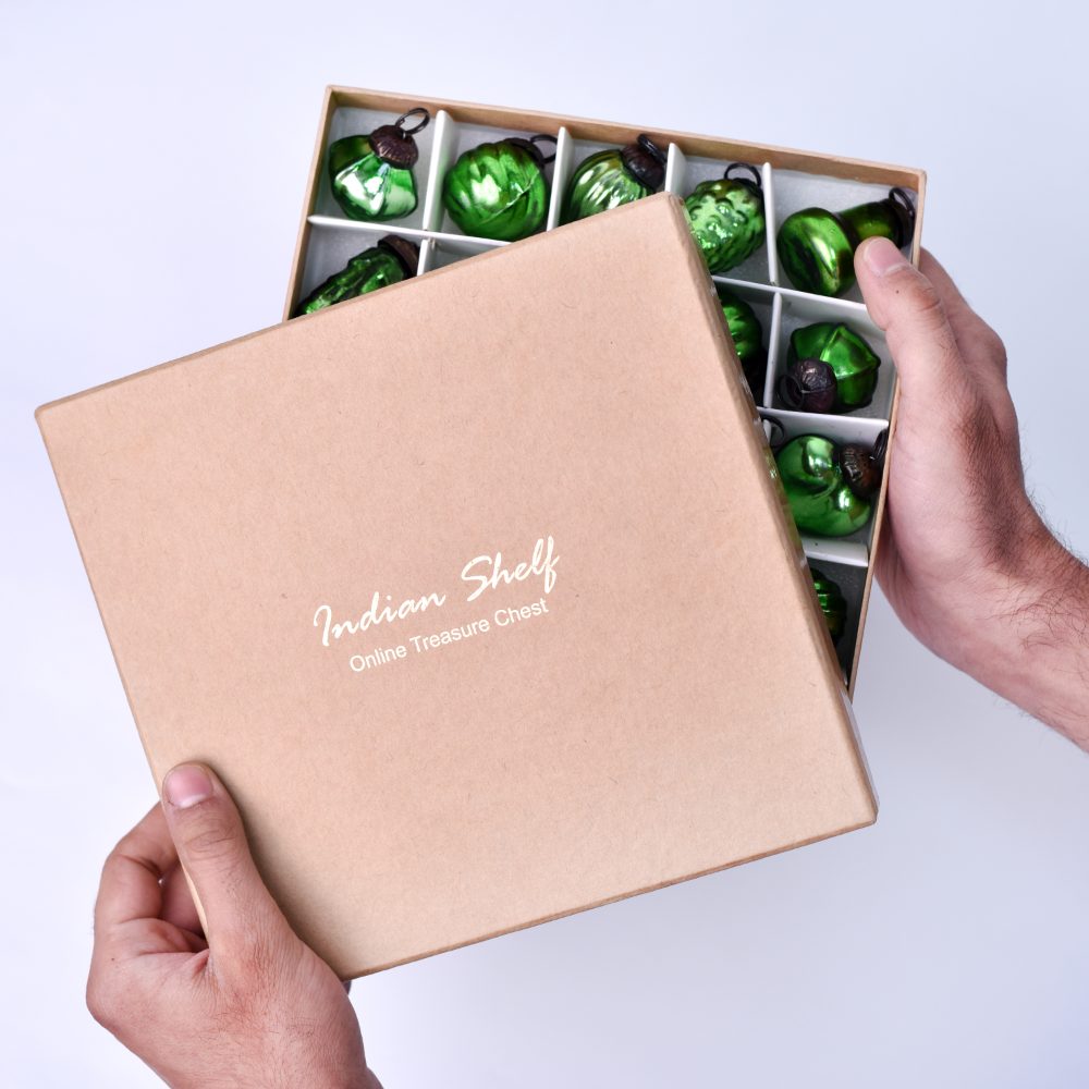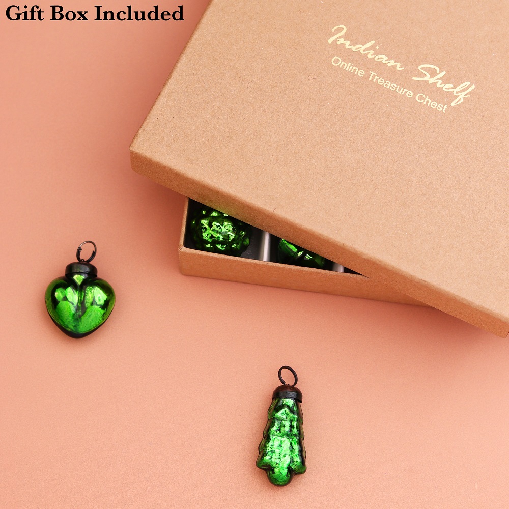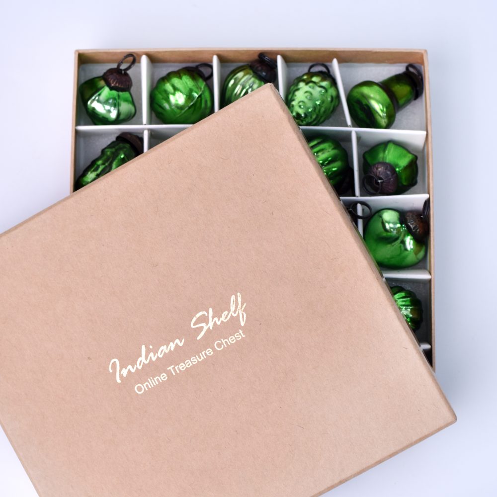 Enhance your festive celebrations with our exquisite set of 25 handmade glass Christmas ornaments in a stunning shade of green. Crafted with precision and love by skilled Indian artisans, each ornament is a testament to the artistry and craftsmanship passed down through generations. This enchanting collection features an array of unique shapes, adding a touch of whimsy and elegance to your holiday decor. Whether adorning your Christmas tree, gracing your wedding ceremony, embellishing a bridal shower party, or enhancing your home and garden decorations, these ornaments promise to infuse a sense of magic into any occasion. The vibrant green hue symbolizes life, renewal, and prosperity, making it an ideal choice for a wide range of festivities. Each ornament is meticulously crafted, ensuring durability and timeless beauty that will be cherished for years to come. Not only do these ornaments enhance your decor, but they also make for heartfelt gifts for your family, friends or relatives on special or festive occasions. Share the joy of the season with these handcrafted treasures that capture the spirit of celebration and togetherness. Elevate your holidays with these charming green glass Christmas ornaments and create memories that shine brightly.