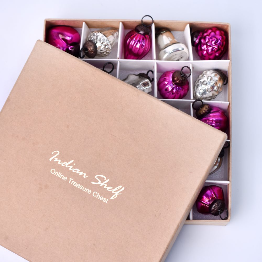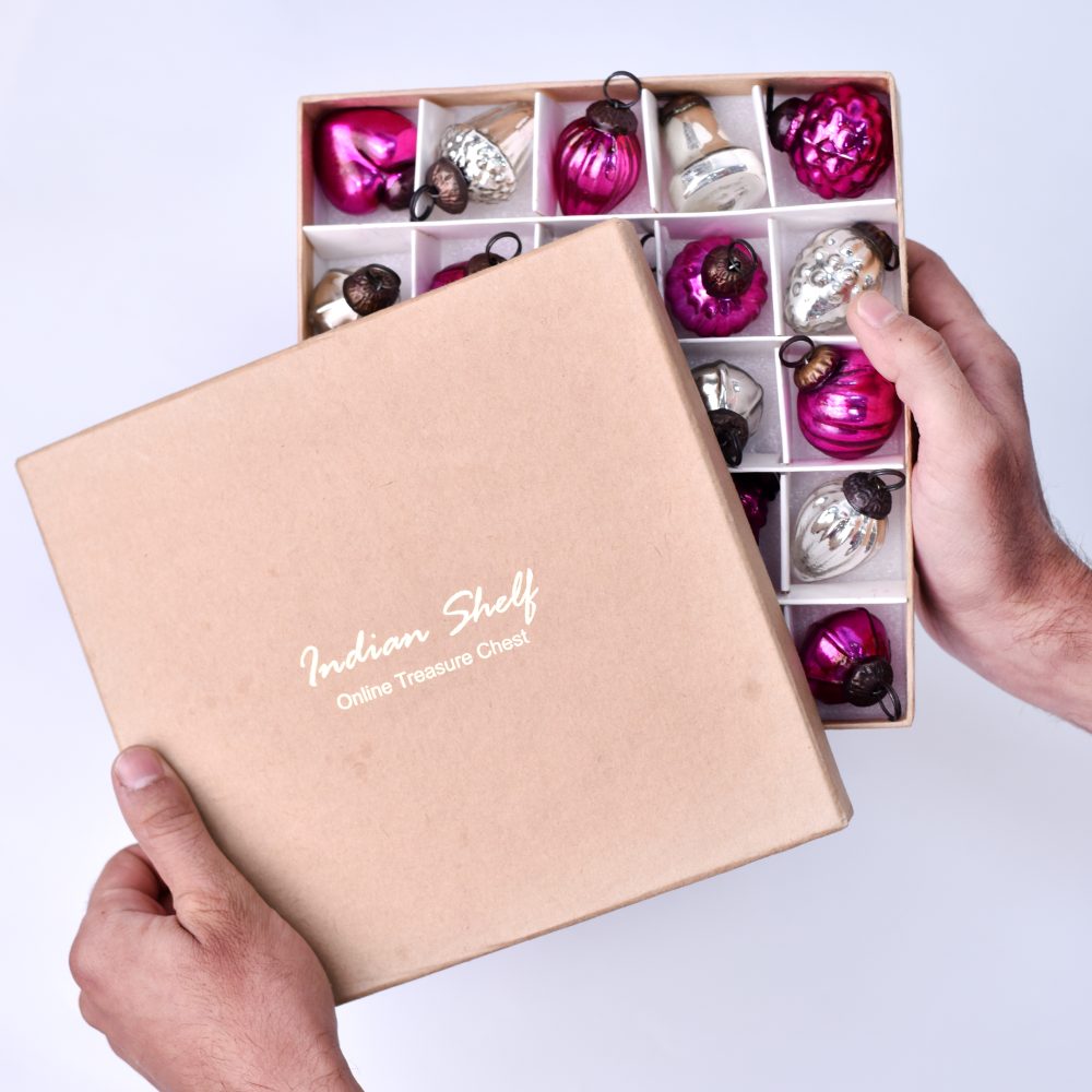 This set of 25 Glass Christmas Ornaments is meticulously crafted in enchanting pink and silver hues. Each ornament is a unique masterpiece, handcrafted with precision and care by highly skilled Indian artisans, adding a touch of tradition and artistry to your celebrations. This versatile set offers an array of shapes, ensuring a diverse and captivating display. The ornaments effortlessly transition from Christmas tree adornments to year-round decor, making them suitable for home, office, hotel, or shop decoration. Their shimmering magenta and silver tones add a touch of opulence and sophistication to any space. These ornaments are not limited to Christmas alone, they can also enhance the ambiance of your home during various festivals and special occasions. Whether adorning your holiday tree, creating a captivating centerpiece, or adding charm to your living spaces, these ornaments are designed to delight. Share the joy of the season with your family, friends or relatives by gifting them these handmade treasures. Their timeless beauty and craftsmanship make them a thoughtful and memorable present for any special or festive occasion. Illuminate your surroundings with the elegance of our Glass Christmas Ornaments and make every moment magical.