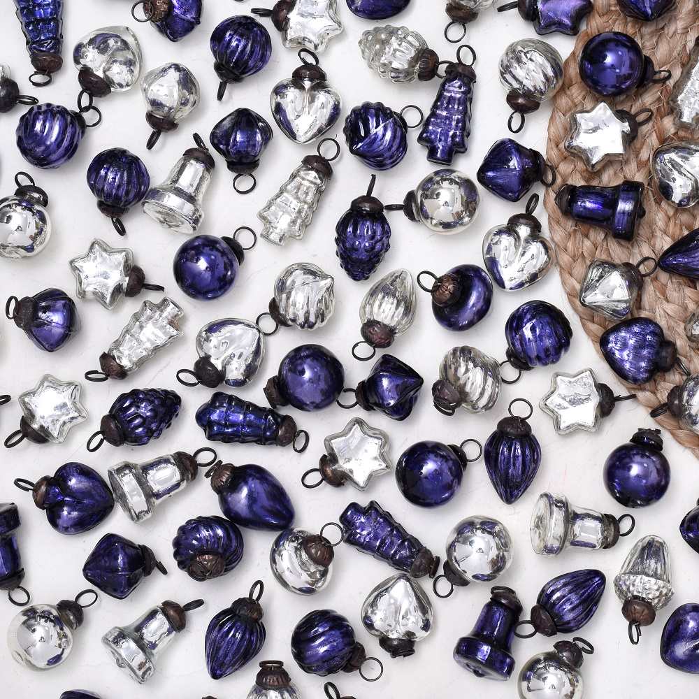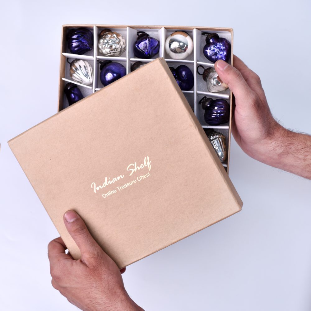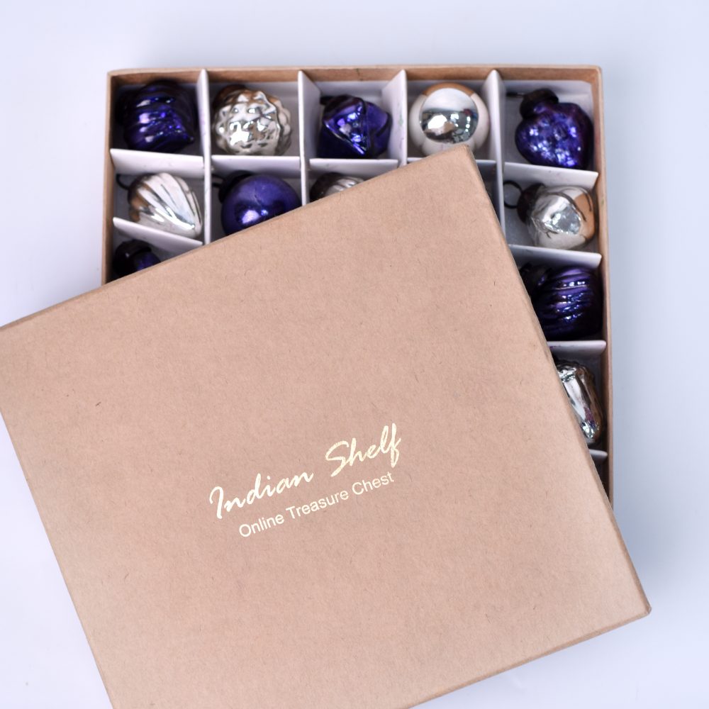Add a touch of elegance and tradition to your holiday decor with this set of 25 handmade glass Christmas ornaments. Crafted with care by highly talented Indian artisans, each ornament is a testament to their craftsmanship and attention to detail. The set features a stunning combination of purple and silver hues, adding a regal and festive flair to any setting. These ornaments come in a variety of charming shapes, ensuring a delightful mix for your decorating needs. Whether adorning your home, office, hotel, or shop, these ornaments create a magical atmosphere during Christmas, house decorations, and various festivals. Hang them on your tree, wreaths, garlands, or even use them as table centerpieces for a shimmering holiday display. Not only are these ornaments perfect for your own celebrations, but they also make for thoughtful gifts on special occasions or during the festive season. Share the joy of the holidays with your loved ones by gifting them this set of exquisite glass Christmas ornaments, a true symbol of craftsmanship and festive spirit.