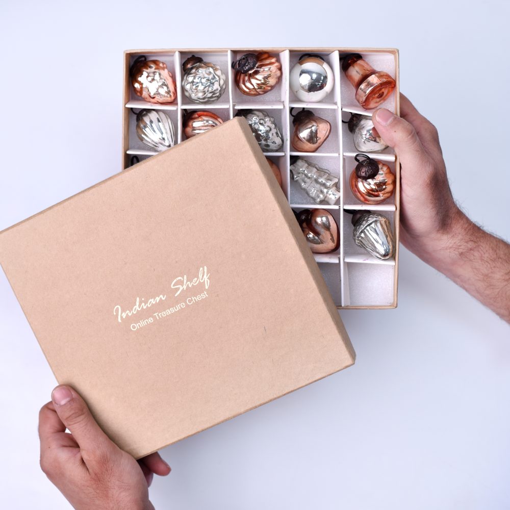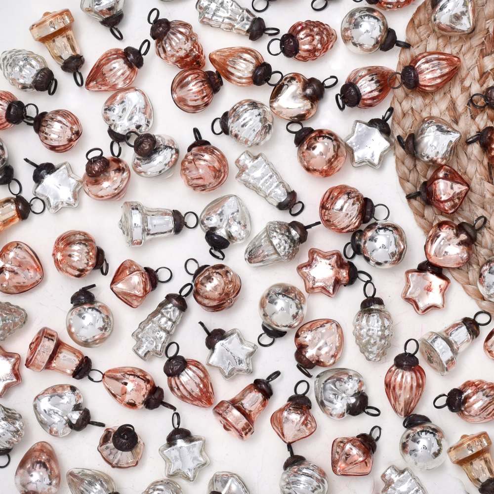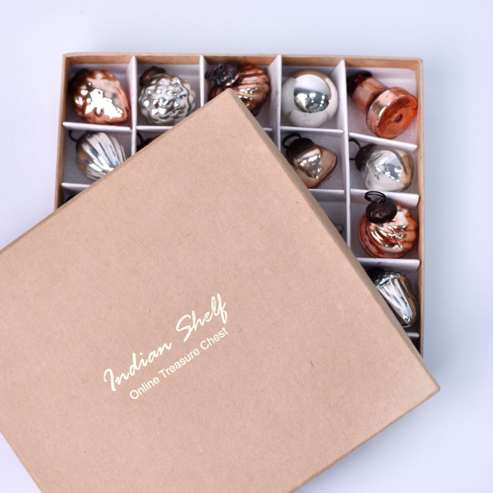 This set of 25 glass Christmas ornaments is beautifully crafted in the enchanting hues of rose gold and silver. Each piece is meticulously handcrafted by skilled Indian artisans, ensuring a unique and artisanal touch to your festivities. This ornament set offers an array of charming shapes and designs, adding a touch of elegance and sophistication to your Christmas tree or any festive setting. The delicate blend of rose gold and silver adds a touch of opulence to your home, office, hotel, or shop decorations. These ornaments are not limited to Christmas alone, they are versatile enough to adorn your space during various festivals and celebrations. Their timeless appeal makes them a perfect addition to housewarming parties, weddings, or other special occasions. With their fine craftsmanship and attention to detail, these ornaments make for a thoughtful and cherished gift for your family, friends or relatives. Share the joy of the season by gifting them these exquisite decorations that capture the essence of Indian artistry and the spirit of celebration. Create memories and celebrate in style with this stunning set of glass ornaments.