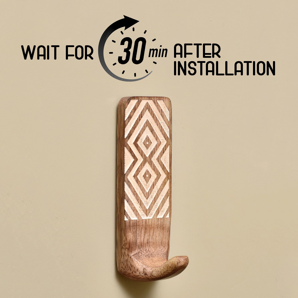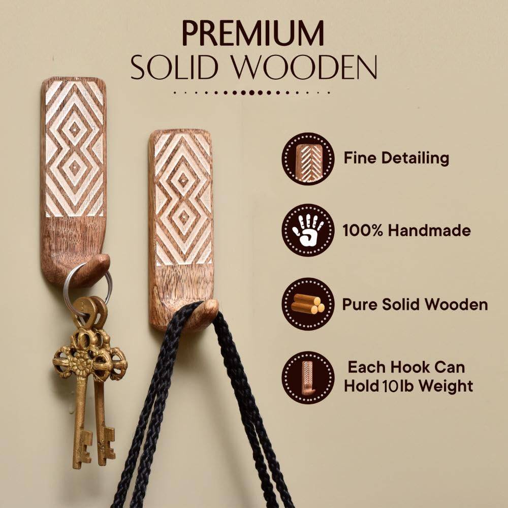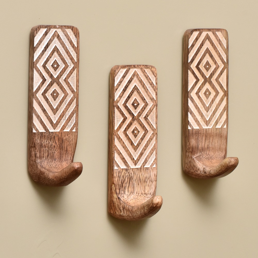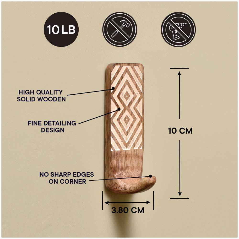 A set of 3 brown wooden wall hooks that are adorned with a captivating white colour pattern meticulously engraved by talented Indian artisans. Each hook is a testament to craftsmanship, carefully handcrafted from high-quality wood, ensuring durability and a touch of elegance to your living space. Designed with versatility in mind, these hooks are perfect for hanging towels, clothes, hats, bags, keys, scarves, and jackets, providing a stylish and functional solution to keep your space organized. The earthy brown tone of the wood combined with the intricate white pattern adds a rustic charm, blending seamlessly with various interior styles. What sets these hooks apart is their adaptability to different wall types. Engineered as adhesive hooks for painted walls, these versatile accessories can be easily installed without the need for drilling or hardware. The stick-on design ensures a hassle-free application, making them removable wall hooks that leave no trace behind when repositioned. Celebrate special occasions or festivals by gifting these handmade wall hooks to your family, friends or relatives, offering them not just a practical organizational solution but also a piece of art that reflects the rich craftsmanship of Indian artisans. Elevate your home decor and simplify your daily routine with these charming, functional, and removable wall hooks.
