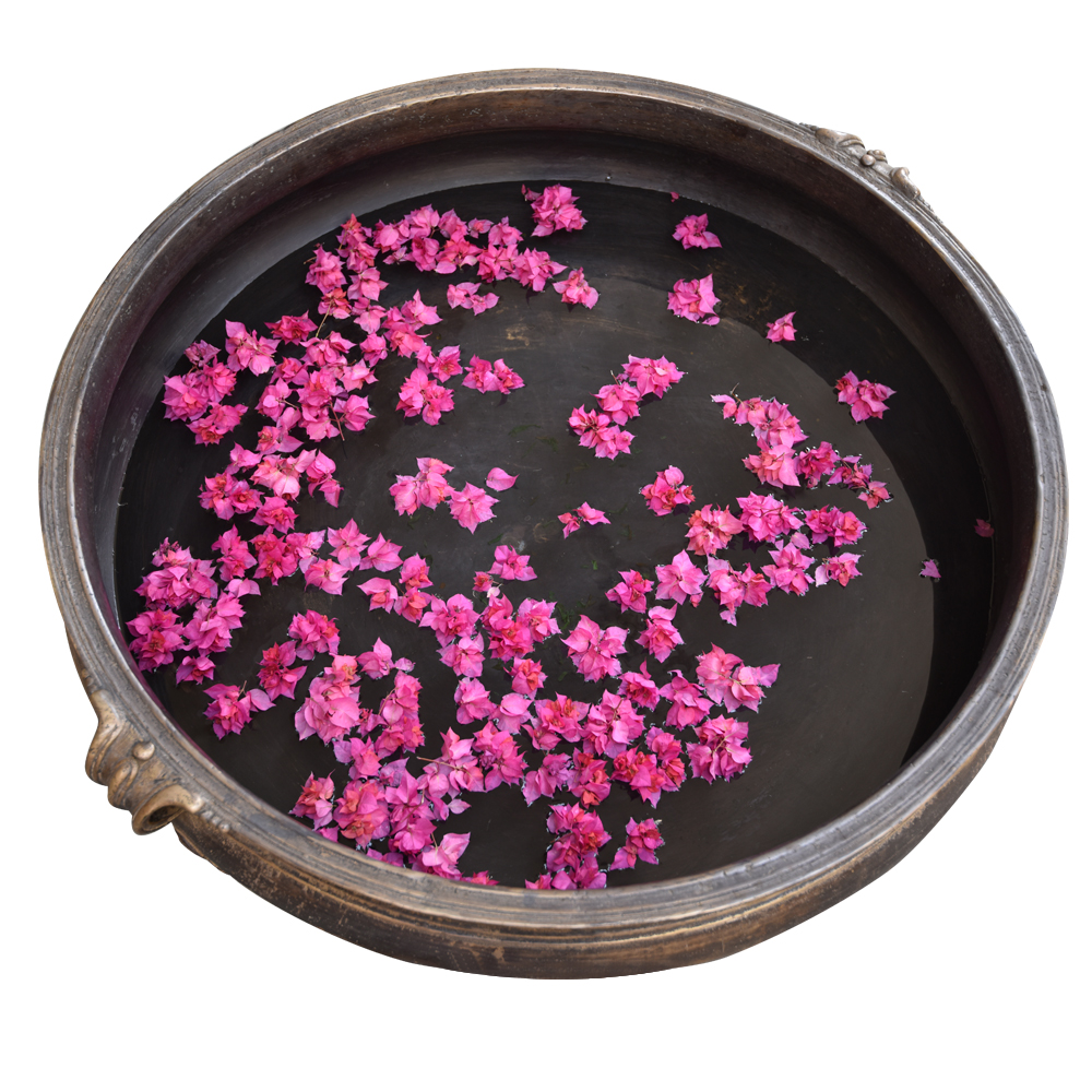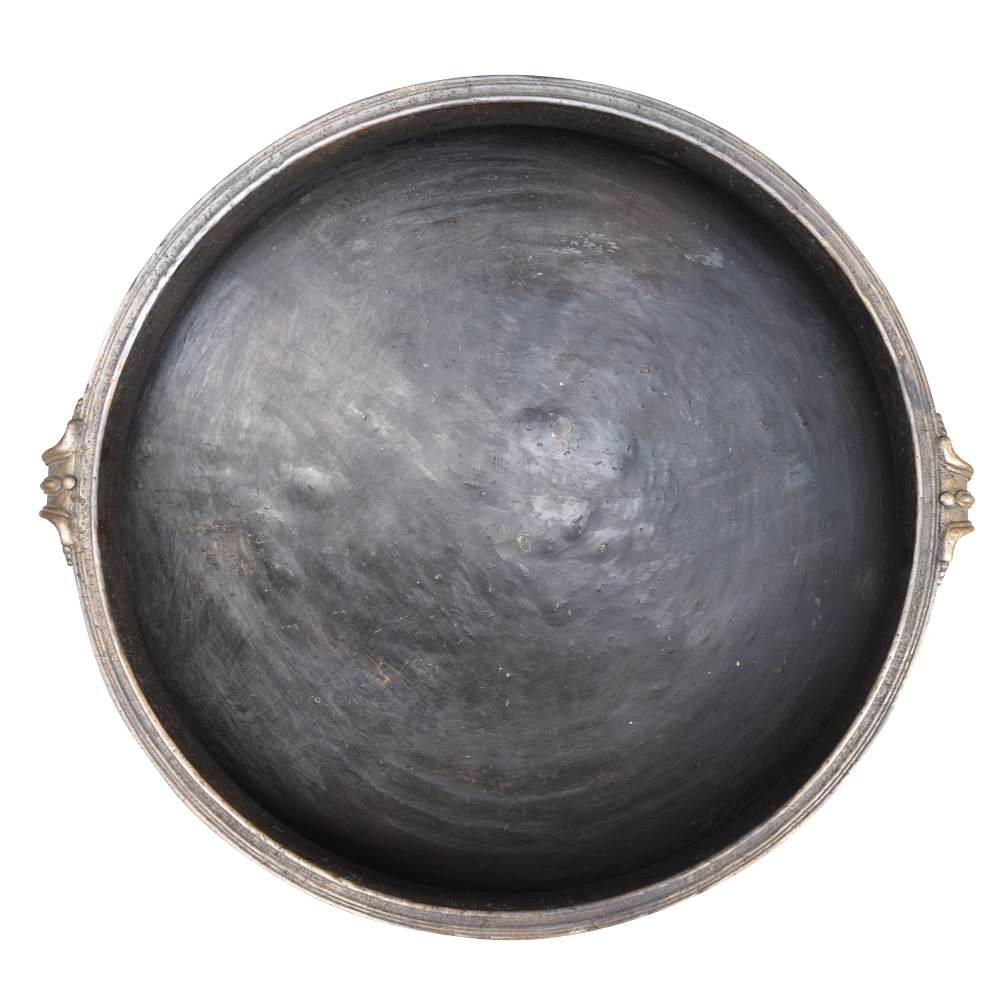 Bronze urli indian style with handle having beautiful ornamentation. Ideal to put flowers and floating candles and use it as a perfect indoor/outdoor decoration. It is completly done by hand. It serves as a beautiful bronze bird bath too.