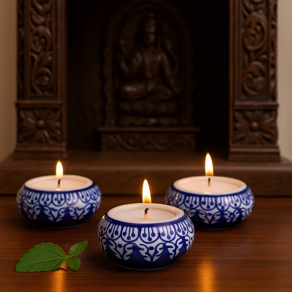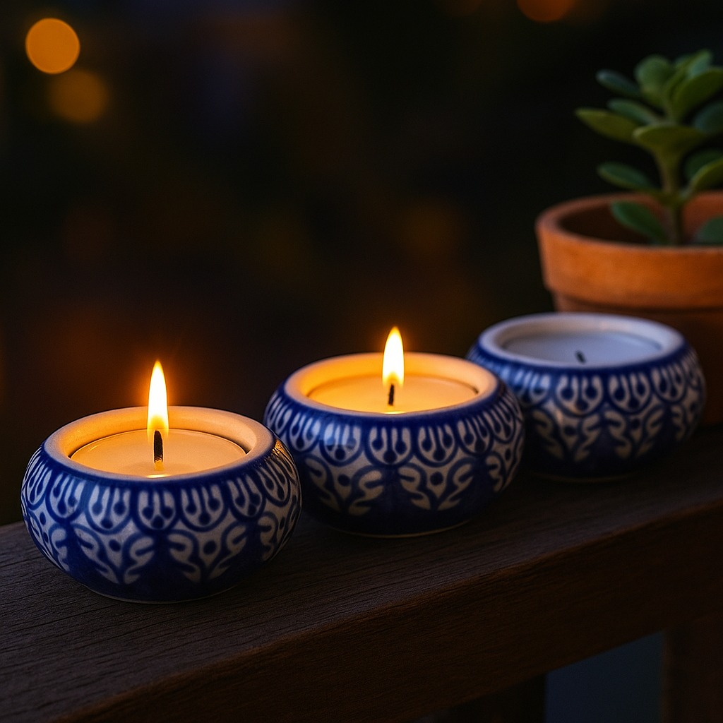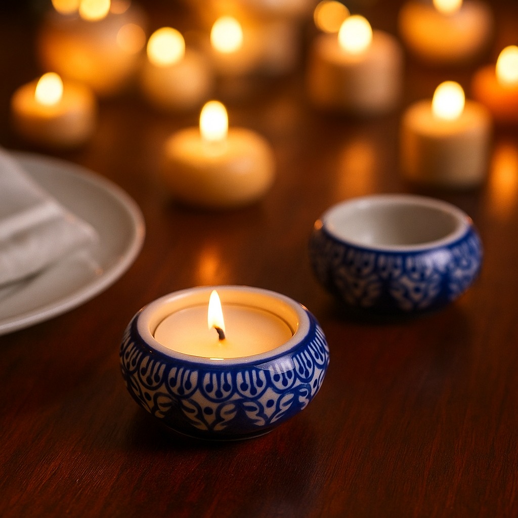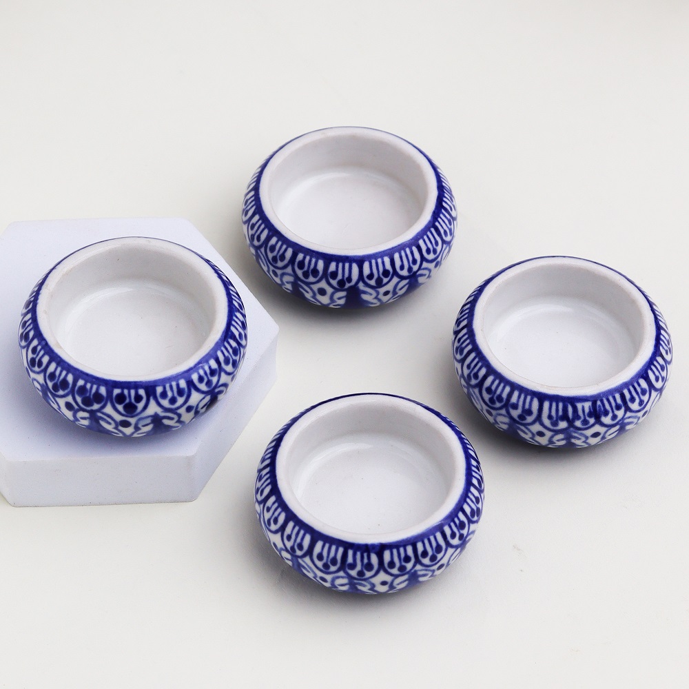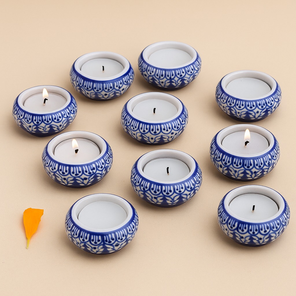 Buy a ceramic tea light holder online that is a harmonious fusion of high-quality craftsmanship and cultural artistry. Handmade by skilled Indian artisans, each piece reflects their dedication to their craft. This captivating tea light holder boasts a captivating blend of white and blue hues, reminiscent of tranquil seas and serene skies. Tea light holders have long symbolized warmth and togetherness. As the gentle flicker of the candle dances within the ceramic enclosure, it casts enchanting shadows that create an inviting atmosphere. Perfect for any setting, whether it's your cherished home, a cosy cafe, an elegant restaurant, a charming shop, or a luxurious hotel. Bring charm to your space and create unforgettable moments on special occasions with your loved ones. Illuminate dinners, celebrations, or intimate conversations with the soothing radiance of our tea light holder. It's not just a decoration; it's an experience that ignites feelings of comfort and connection. Looking for an exceptional gift? This handcrafted ceramic tea light holder is an ideal present for your family, friends or relatives on special, festive, or auspicious occasions. Share the joy of artisanal craftsmanship and the magic of soft candlelight with those who matter most. Embrace the cultural heritage, elegance, and intimate glow our ceramic tea light holder offers. Let it transform ordinary moments into extraordinary memories.