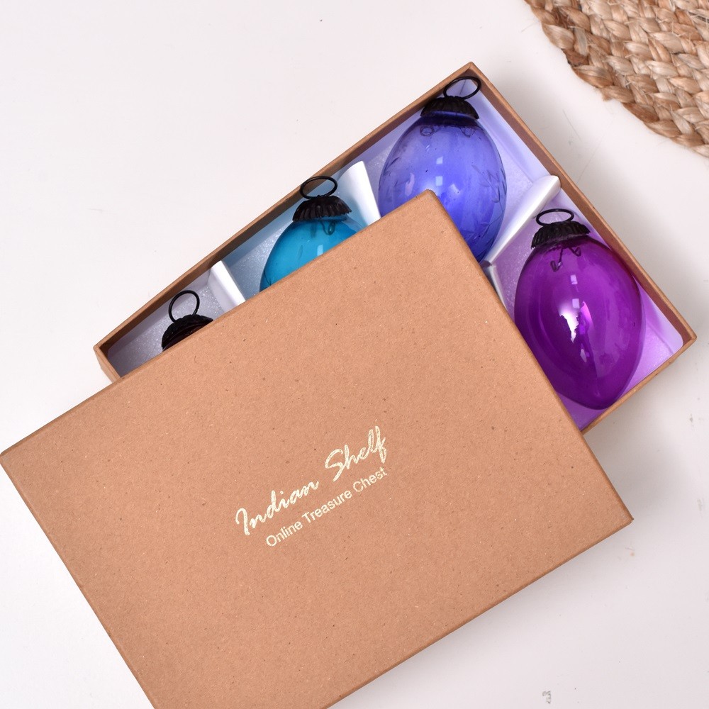 Buy Multicolor glass Christmas ornaments which are unique and handcrafted masterpiece. Crafted by highly skilled Indian artisans, these ornaments are a celebration of craftsmanship, tradition, and elegance. These stunning ornaments come in a variety of shapes, from classic spheres to intricate designs, ensuring a diverse and captivating display on your Christmas tree. The lush multi- colours blend harmoniously, adding a touch of opulence to your holiday decorations. Versatile and enchanting, these ornaments aren't just limited to Christmas. They make a delightful addition to weddings, bridal showers, and other special occasions, elevating the ambiance with their radiant charm. Hang them in your home or garden to infuse every space with a touch of festive cheer. These handcrafted treasures also make for exceptional gifts. Share the joy and craftsmanship with your loved ones on special or festive occasions, leaving a lasting impression of your thoughtfulness and appreciation for beauty.