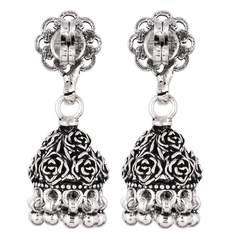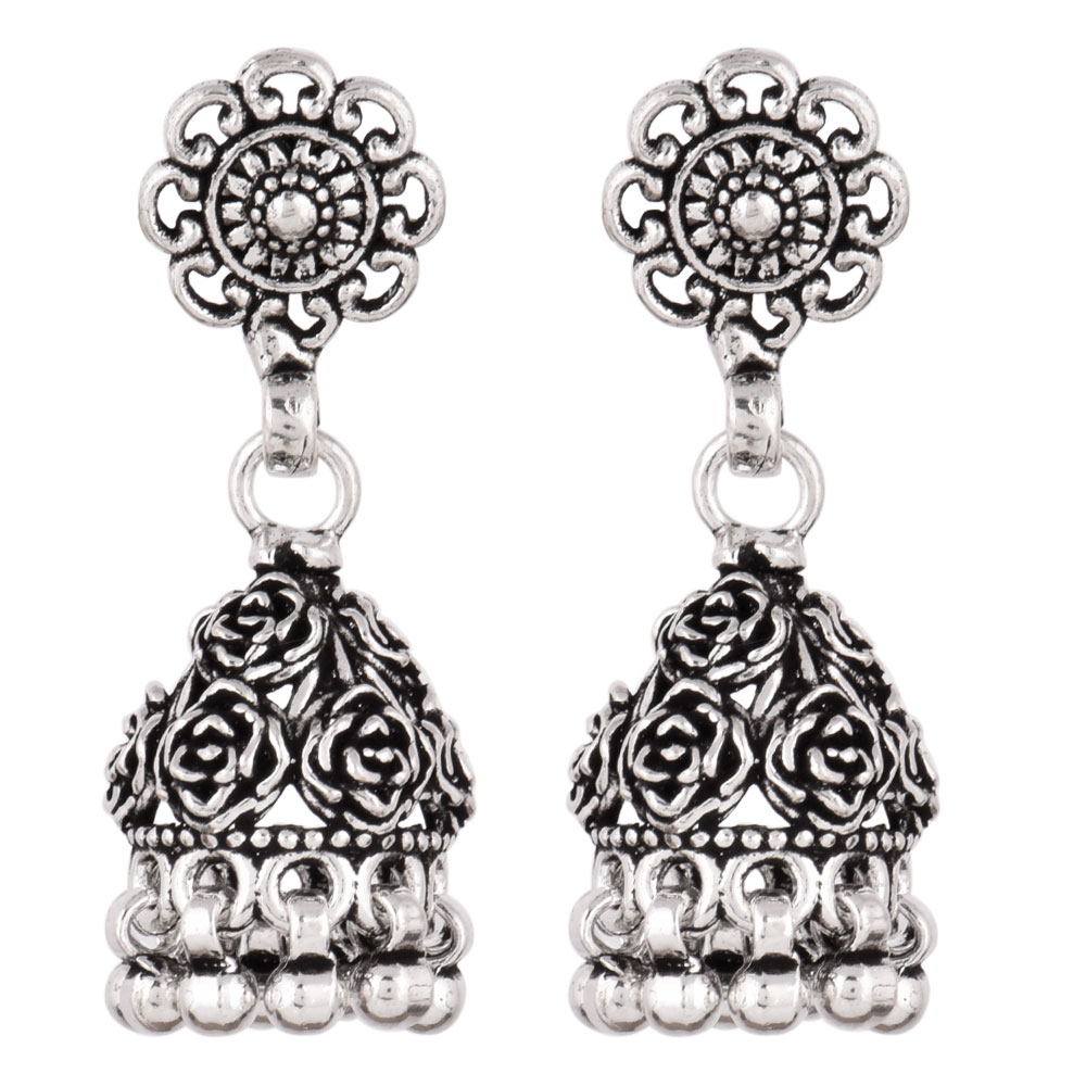 These 92.5 Sterling silver earrings with rose flowers engraved on the jhumkies can be worn at all auspicious function wedding, engagements or during the festival time. It can also be worn on regular basis. It has a lovely engraved Floral top and embellished with metallic beads. An ideal present for your mother, sister or wife.
