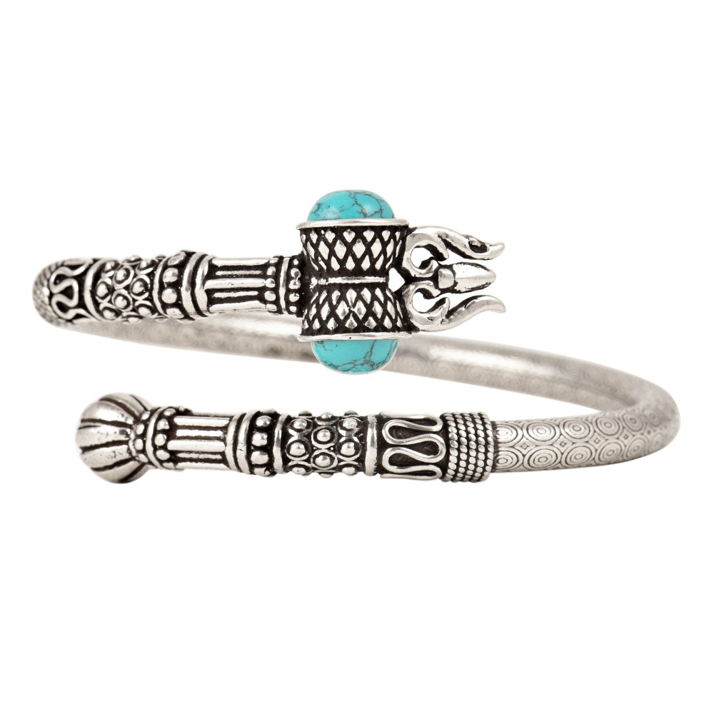 Trishul bangle made in pure 92.5 sterling silver has intricate work with turquoise stone situated inside a dumroo, leading into a Trishul .This Handmade silver bangle can be matched with traditional as well sasual apparels and can be worn to parties, weddings and other auspicious occasions.