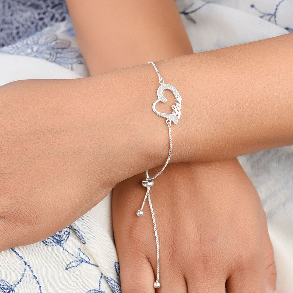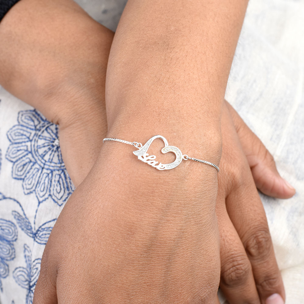 Very Romantic and feminine looking 92.5 Sterling Silver Bracelet with heart and love charm attached to a lovely chain that can be adjusted with the help of a single bead at the end . Gift it to someone you adore and love , present it to her on that special dinner date , on valentine, anniversary or birthdays.