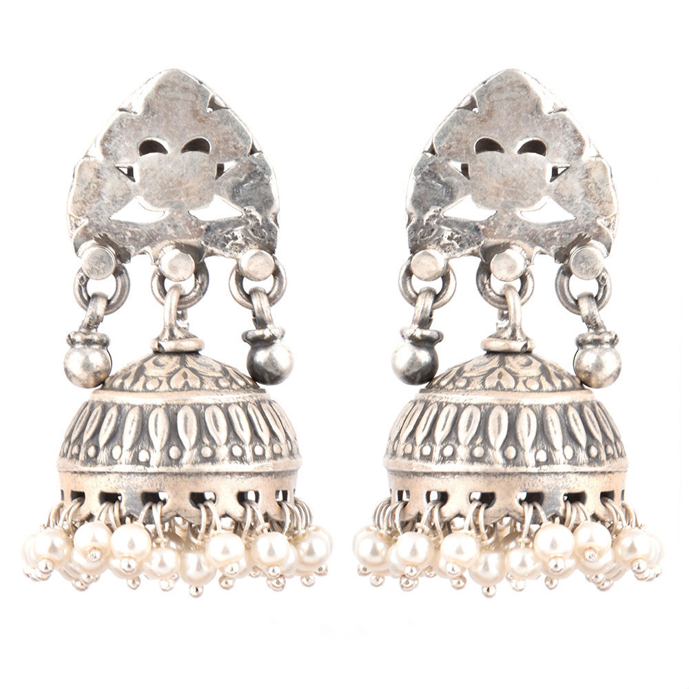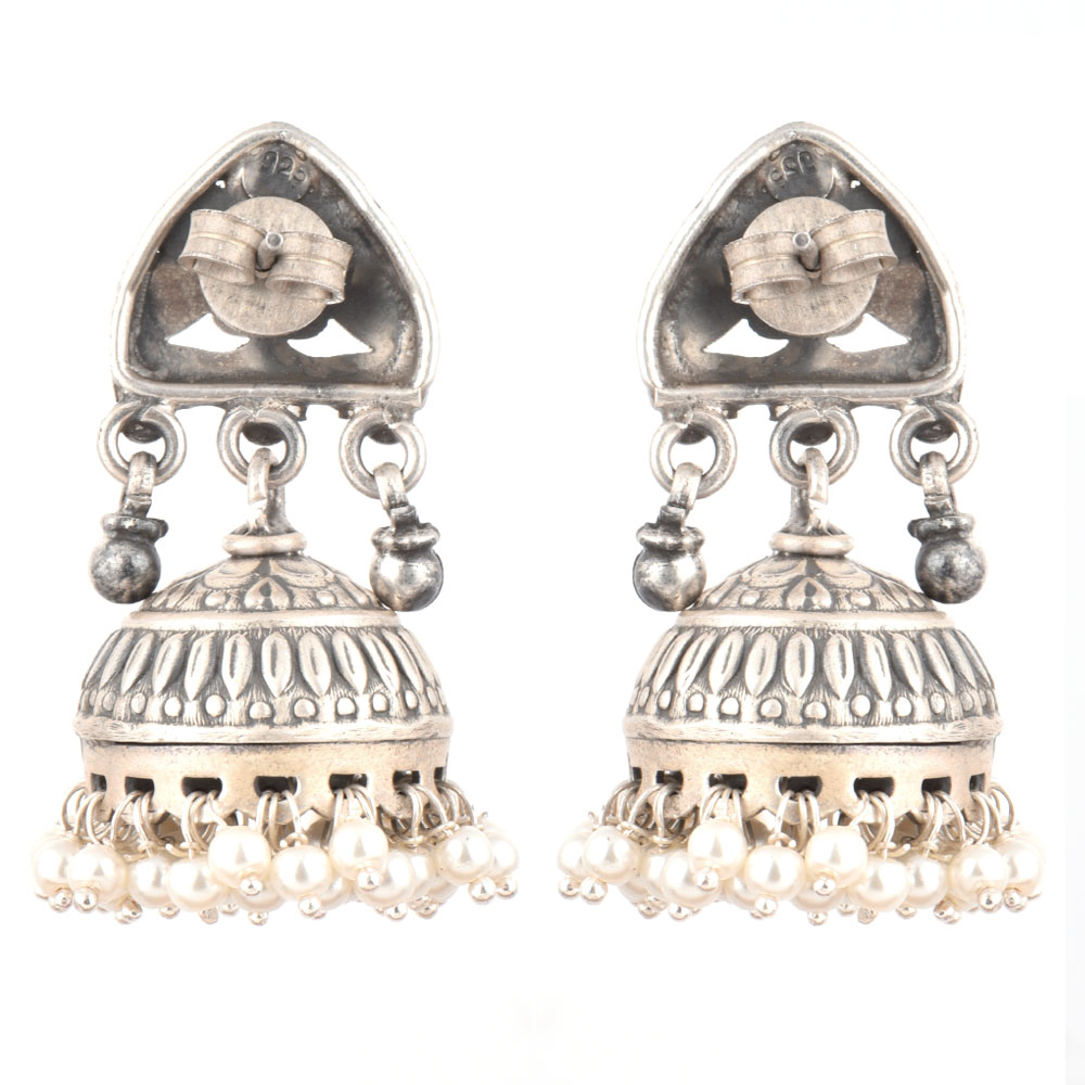 Give a traditional look to all your traditional outfits with this 92.5 Sterling silver earrings with abstract design engraved o the stud with jhumki in oxidized silver engraved design silver bead hanging at the base of the jhumkis. Light and comfortable for everyday wear. Gift it to your sister, mother or friend.