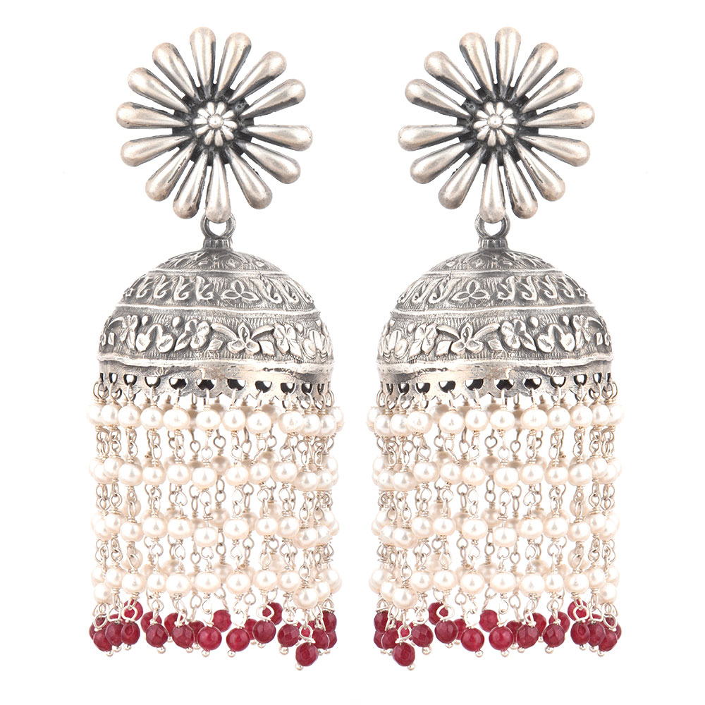 Handcrafted fusion traditional and modern design 92.5 Sterling Silver Earrings with a big petals flower design and jhumki engraved with floral design and tassels made of small sterling silver beads finished with small red onyx beads attached to the jhumki. Perfect to be worn on an engagement, wedding, cocktail, reception party or other special function.