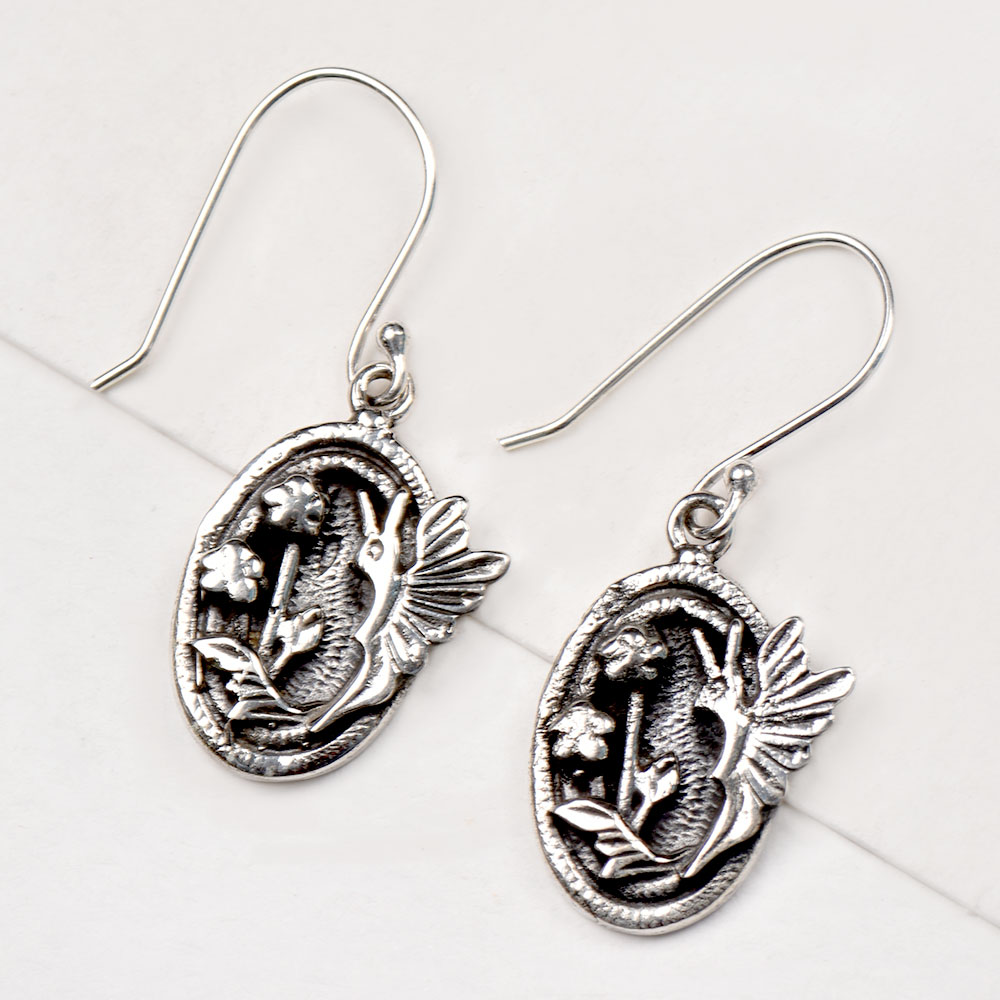 Handmade sterling silver drop earrings with bird sitting o branch with flowers are the ideal gifts for birthdays, wedding and anniversary gift. These round Floral sterling silver dangle earrings are such fun to wear. Their darkened patina and highly polished pattern gives it a boho chic appeal