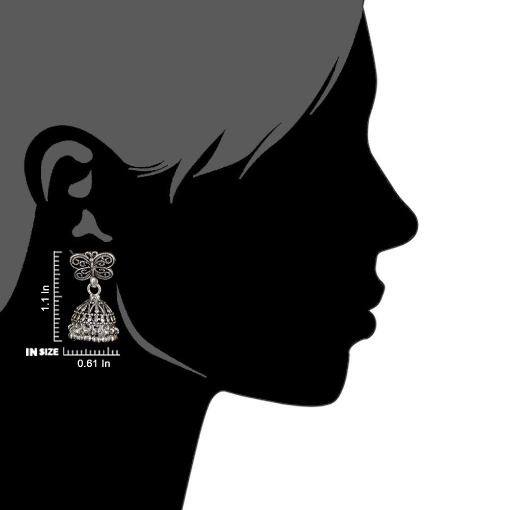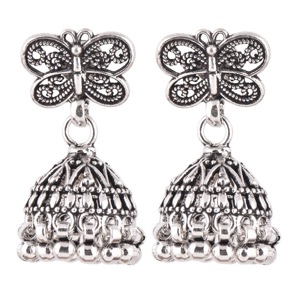 A unique looking 92.5 Sterling Silver Jhumkis Pair in Dome shape with butterfly engraved Stud on the top with hanging silver bells from our tribal jewellery collection. Wear it with a suit or a saree, for an ethnic yet classy look.