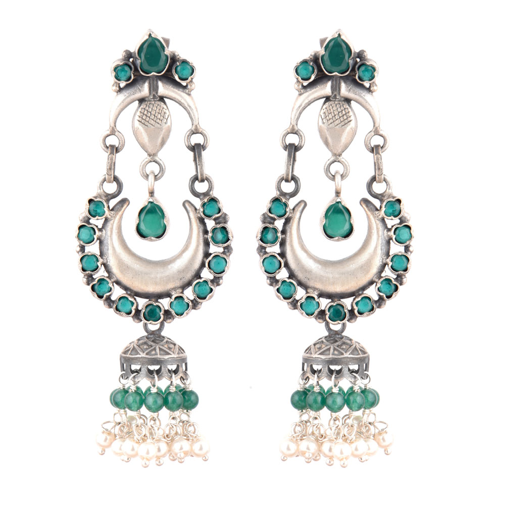 Enhance your look with this traditionally handmade 92.5 sterling silver green onyx Jhumki earring pair that looks stunning and is preciously suitable for all kinds of dressy occasions. Perfectly suited for Wedding, Ethnic, Festive Party wear.