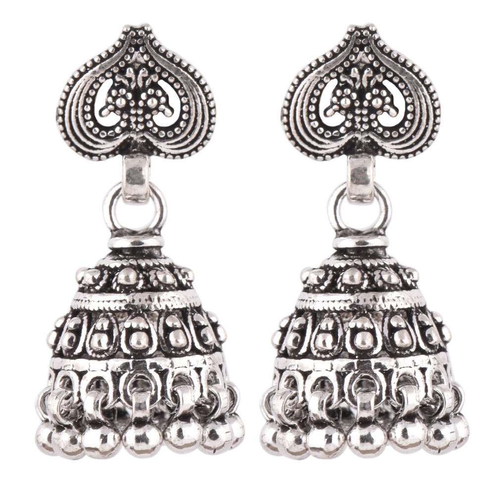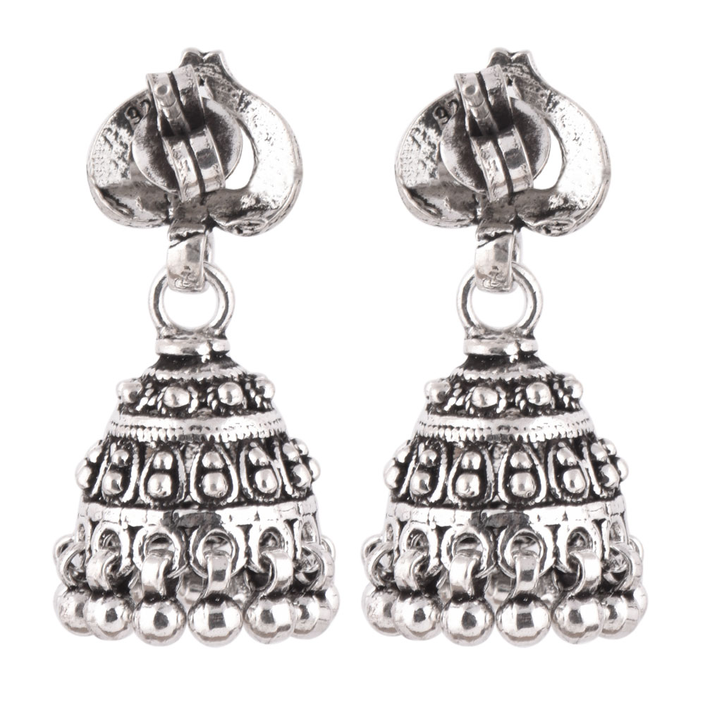 These 925 Sterling silver jhumkis can be worn at all auspicious function wedding, engagements or during the festival time. It can also be worn on regular basis. It has a lovely peacock motif top and embellished with metallic beads. An ideal present for your mother, sister or wife.