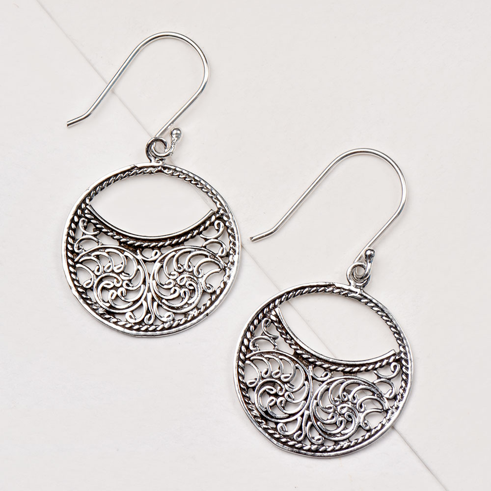Stylish and fashionable handmade sterling silver drop earrings are the ideal gifts for birthdays, wedding and anniversary gift. These round Floral sterling silver dangle earrings are such fun to wear. Their darkened patina and highly polished pattern gives it a boho chic appeal.