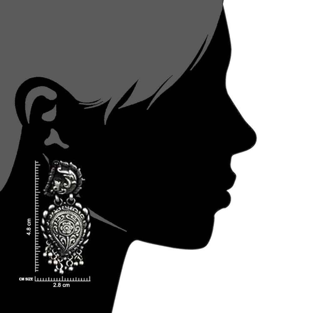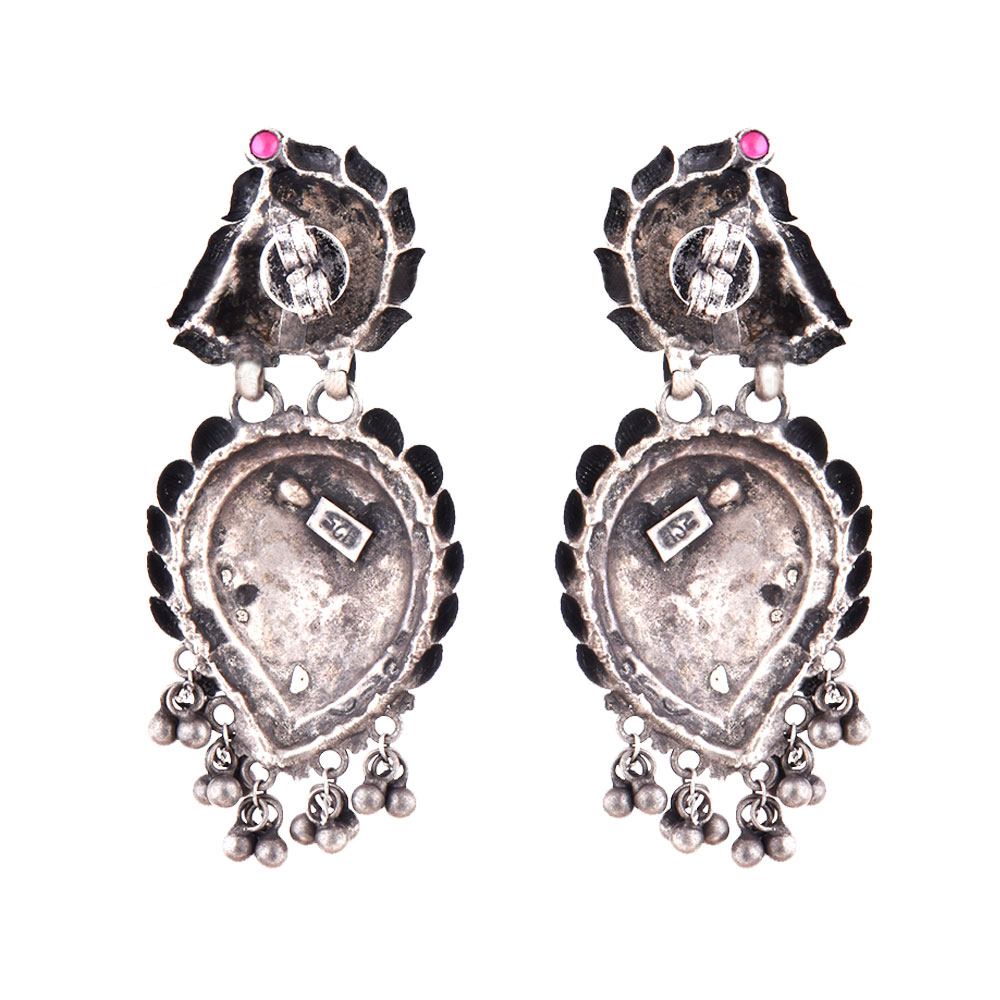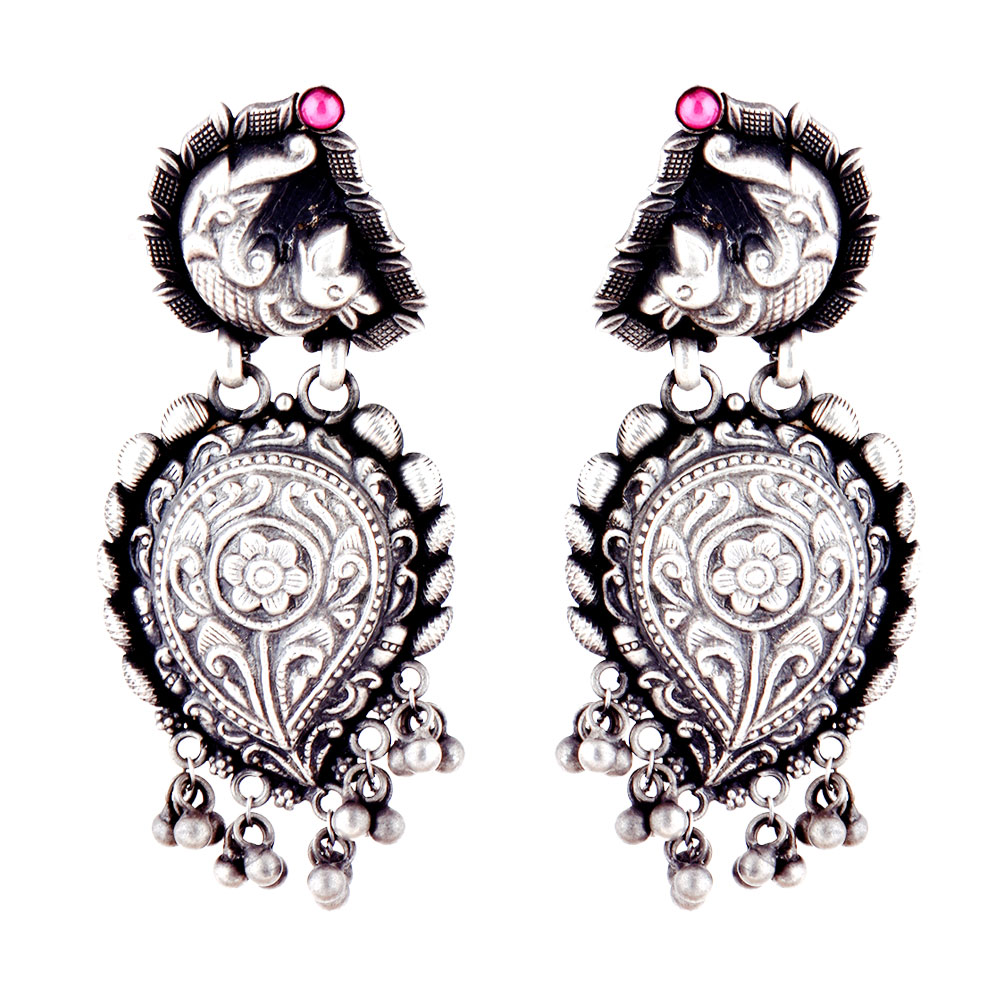 92.5 Sterling silver earrings has a fish engraved on the stud with floral design engraved on the hanging further decorated with silver ghungaroos that make a lovely sound. Give feminine touch to your traditional attire for wedding, engagements , reception , cocktail party. Wear it yourself or gift it to your near and dear ones.