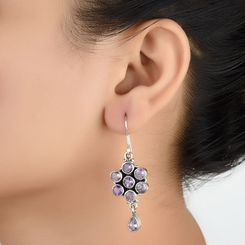 • 92.5 Sterling Silver Earrings Floral Amethst Hanging Earrings