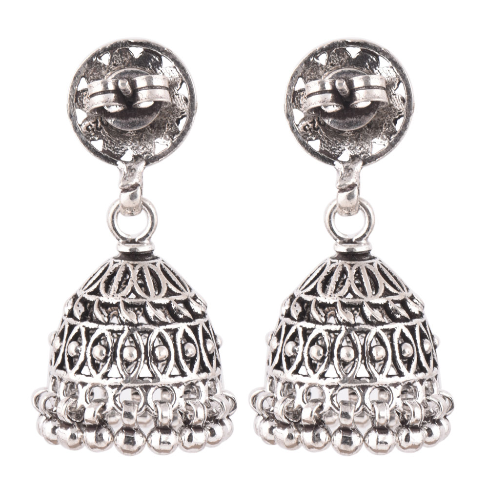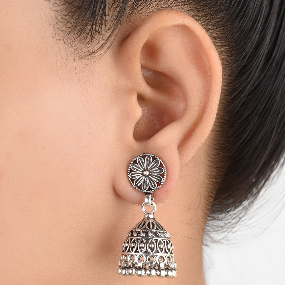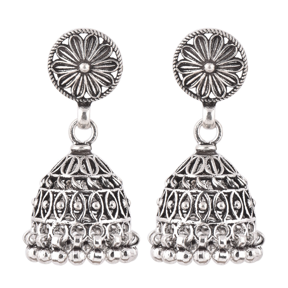 A unique looking 926 Sterling Silver Jhumkies Pair in Dome shape with floral motif on the top with hanging silver bells from our tribal jewellery collection can adorned beautifully with any Indian outfit. Ideal for Work And Casual Wear.