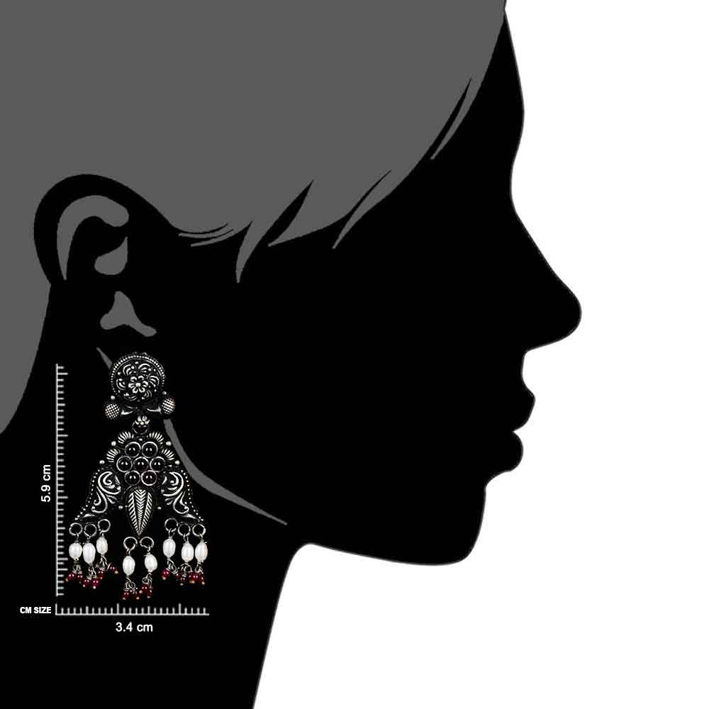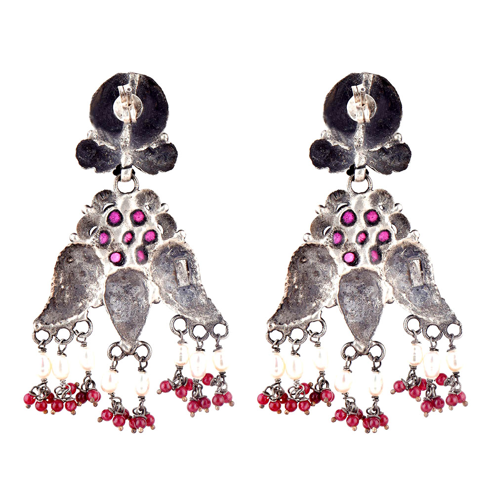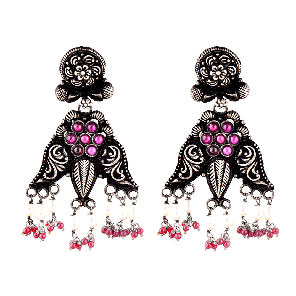 Classy and traditional 92.5 Sterling silver earrings with floral design with three corners engraved with floral design with pearl and red jade beads on the ends . It has an oxidized color and thus compliments both traditional as well as modern outfits . Wear it yourself or your near or dear ones.