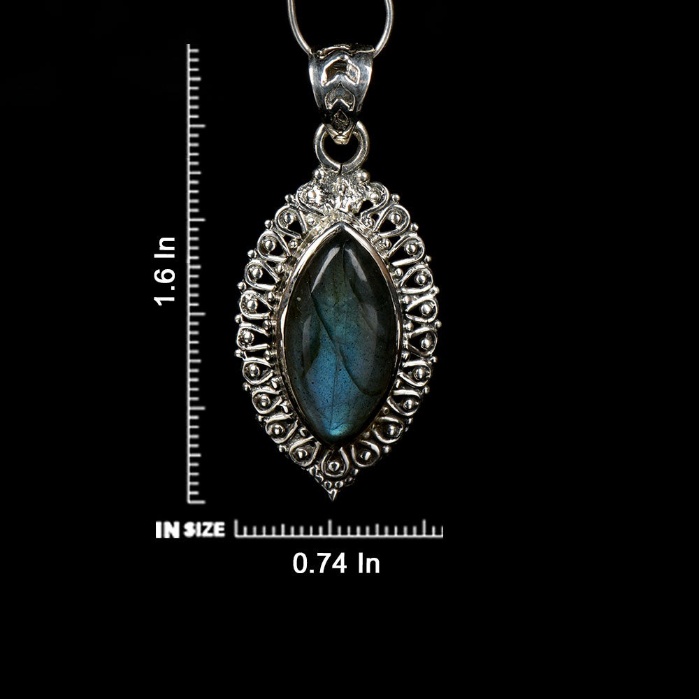 Glowing big Marquise shaped labradorite gemstones are highlighted by 92.5 Sterling Silver Pendant. They resonate a timeless and ancient aesthetic, and are perfect for everyday or a night out! Elegant bezel set pendant is handcrafted by expert artisans of India. Ideal gift for anniversary, Weddings and also for daily wear.