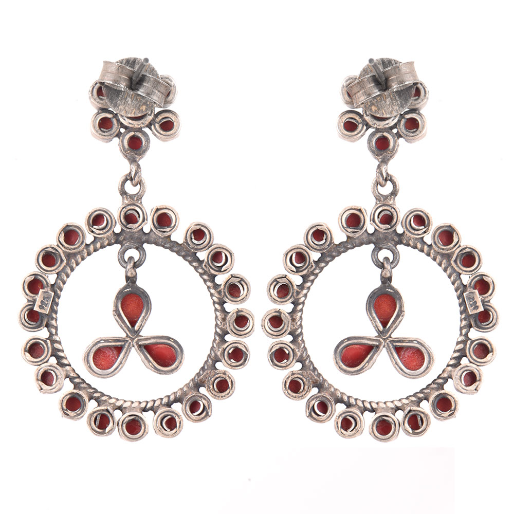 The perfect gift to women these mosaic circle dangle earrings with many coral stone of different shape and sizes with floral stud and heavy round coral stone studded ring fixed to the stud . are a graceful, fashionable and exciting. These circle mosaic earrings are the one you are looking for as a gift for her