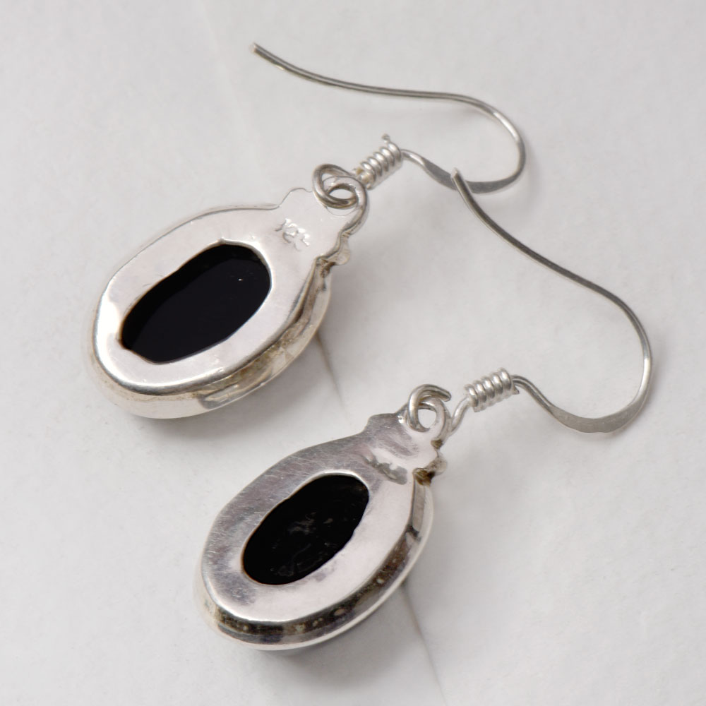 A very trendy looking black long oval onyx stone earrings is the best accessory for girls of all age and group . 92.5 Sterling Silver Earrings has a sparkling black onyx stone in bezel setting and a small hook on the top . Easy and light for everyday wear.
