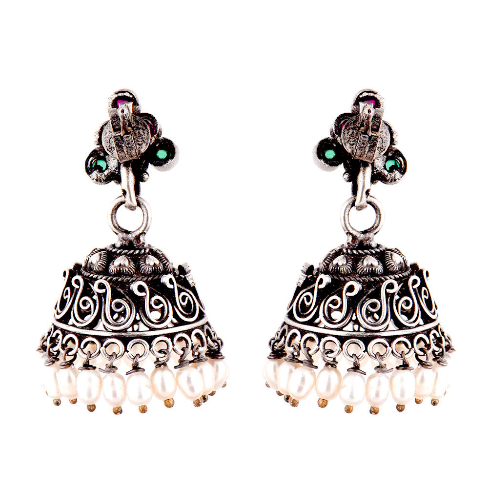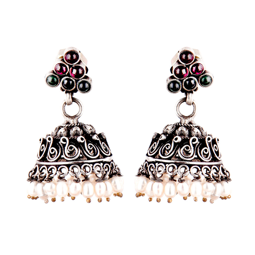92.5 Sterling Silver Earrings Pink Jade and green Onyx Stone Studded Jhumkis with Pearl Hangings with some embossed pattern on the jhumkis . Party wear, anniversary , engagement, valentine , graduation day event. Wear it yourself or gift it to your near or dear ones.
