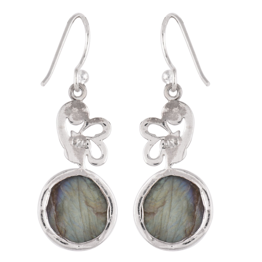 Round Grey Colored Semi precious Jasper Stone in bezel setting with a wired floral design attached to a hook is suitable to be worn with a traditional as well as modern outfit . Light weight and suitable for every day office and a great gift for her.