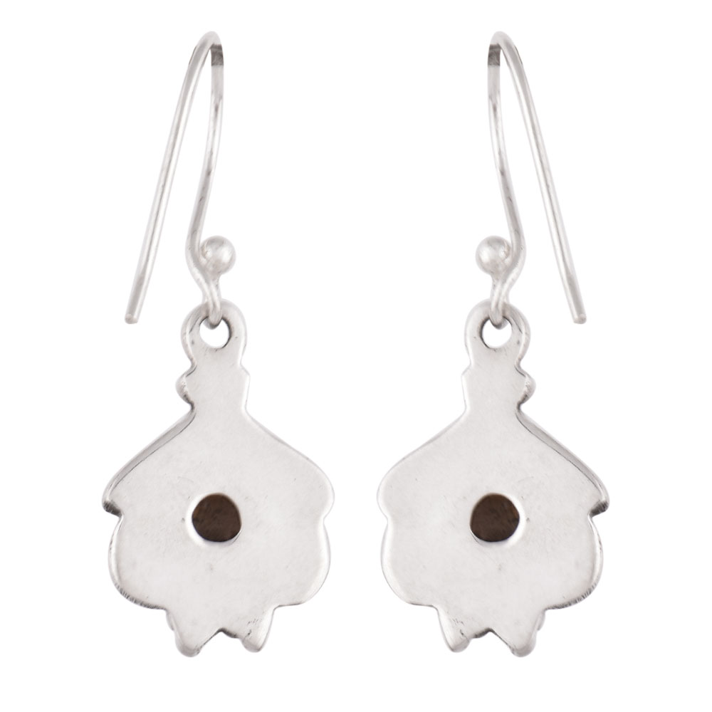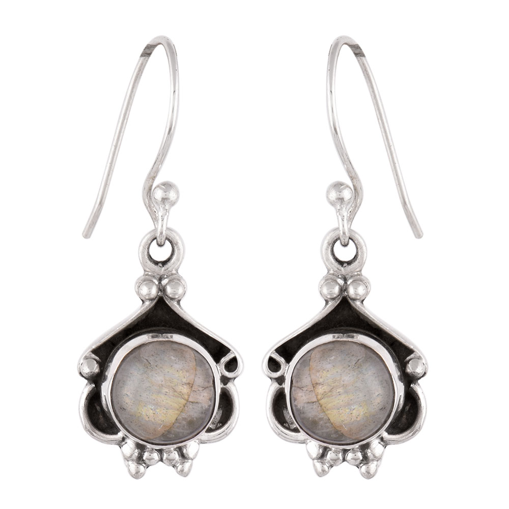 92.5 Sterling Silver Earring with a nice round moonstone pushed into a regal background bezel set with a pair of legs made of three small sterling balls each complete the design of the earrings.