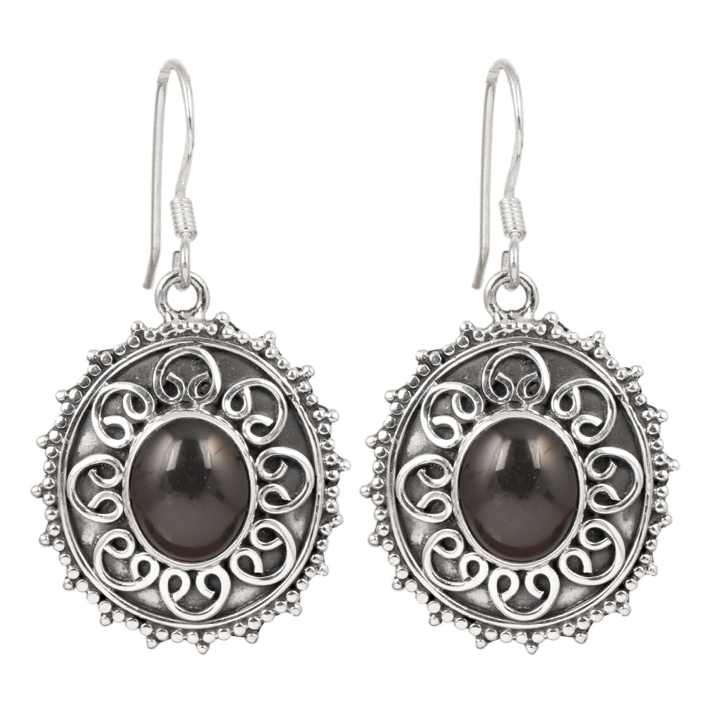 This elegant and classy pair of sterling silver earrings is the perfect accessory you need if you want to achieve that bossy or even gothic look. Handmade to perfection each earring comes with a black oval-shaped stone that is then encircled by engraved design.
