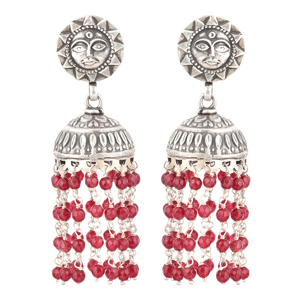 This earrings is actually is 92.5 Sterling Silver Jhumki Earrings handmade by the expert craftsmen of India. It has a unique stud with Sun god face with moustache and tassels made from tiny red onyx beads and silver attachments . Pair it with a nice sari, lehenga or traditional suit.