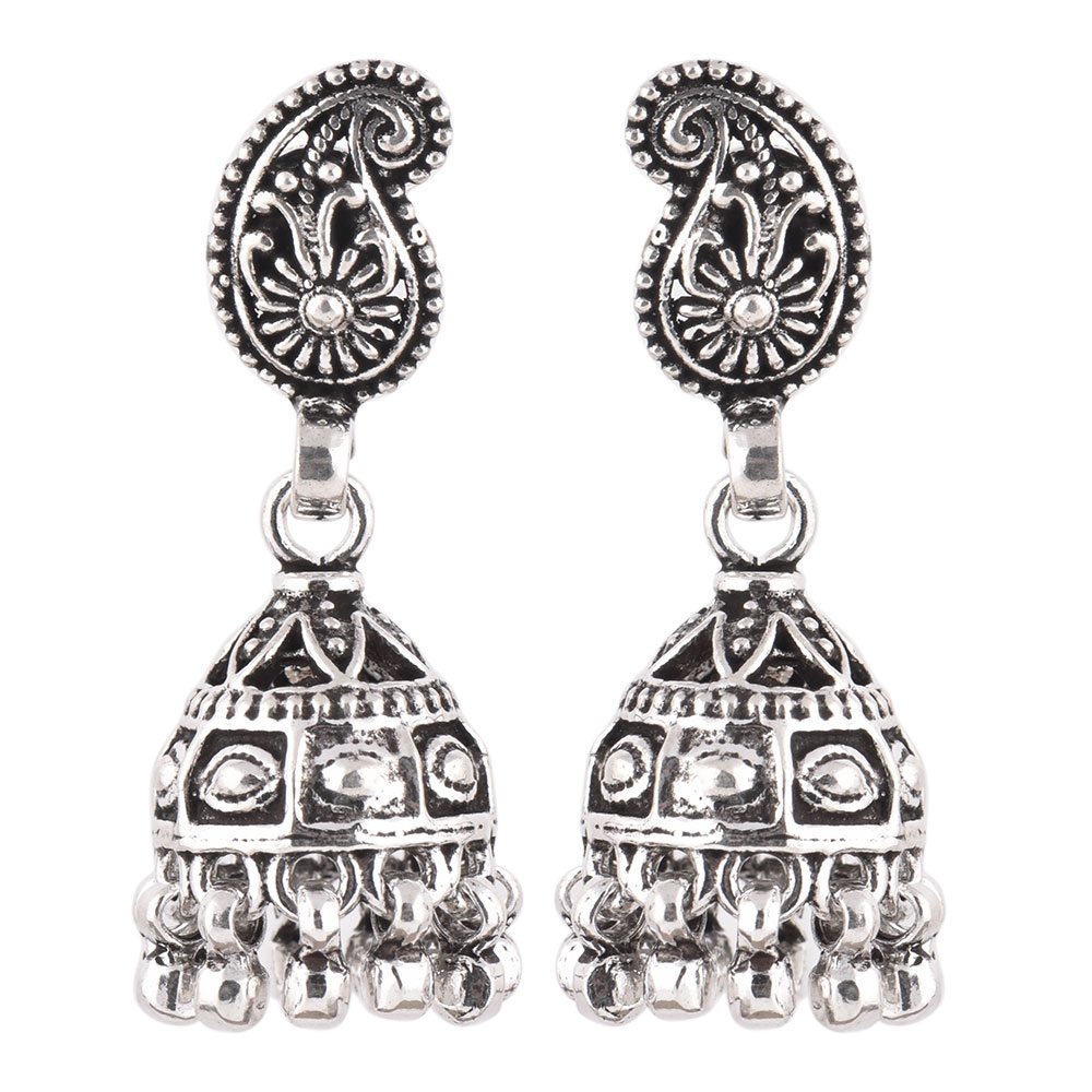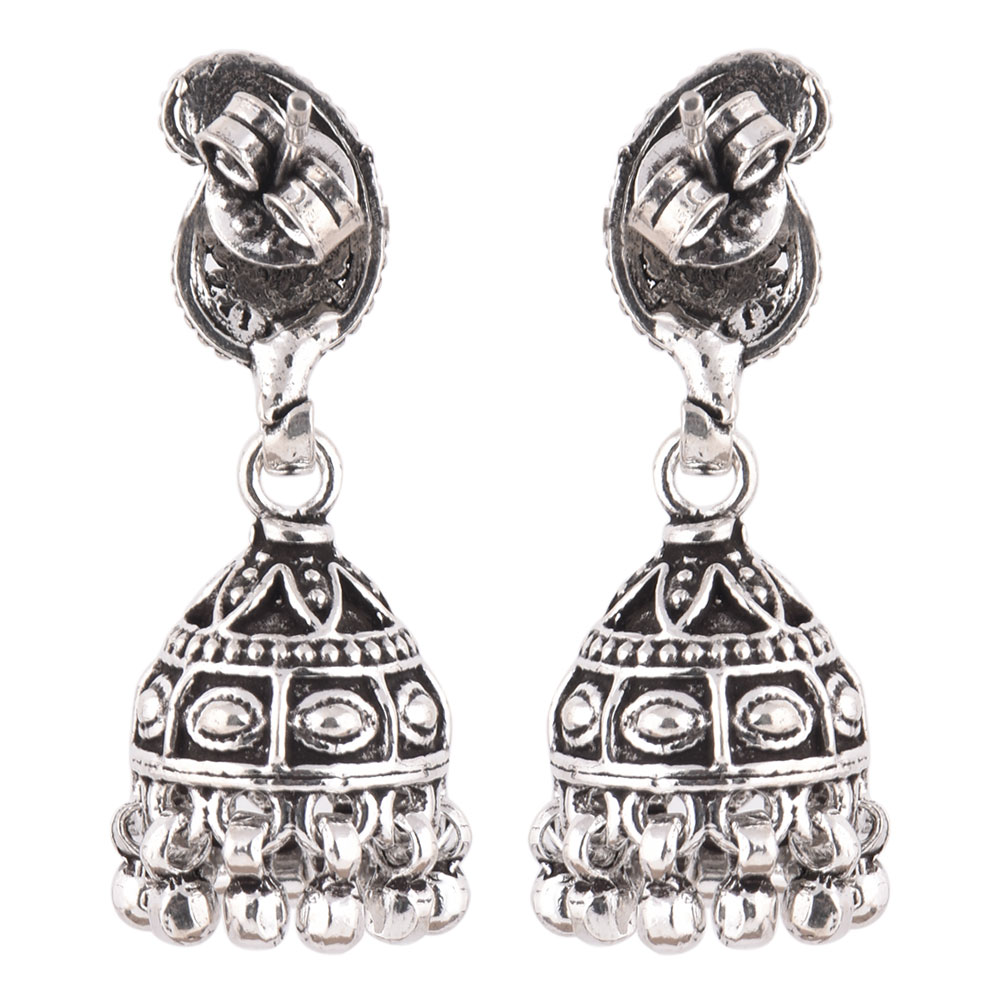 These 925 Sterling silver jhumkis can be worn at all auspicious function wedding, engagements or during the festival time. It can also be worn on regular basis. It has a lovely peacock motif top and embellished with metallic beads. An ideal present for your mother, sister or wife.