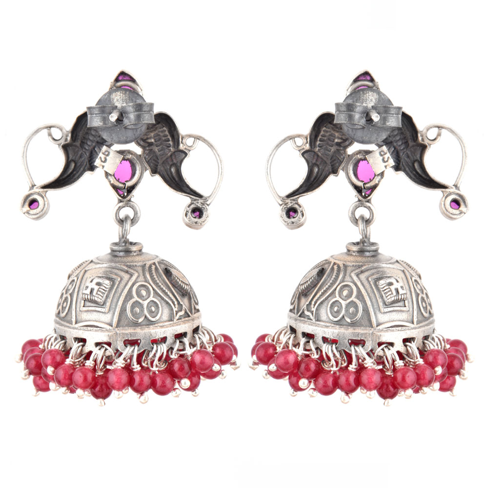 These 92.5 Sterling silver jhumkies can be worn at all auspicious function wedding, engagements or during the festival time. It can also be worn on regular basis. It has a lovely peacock motif top with pink tourmaline beads. An ideal present for your mother, sister or wife.