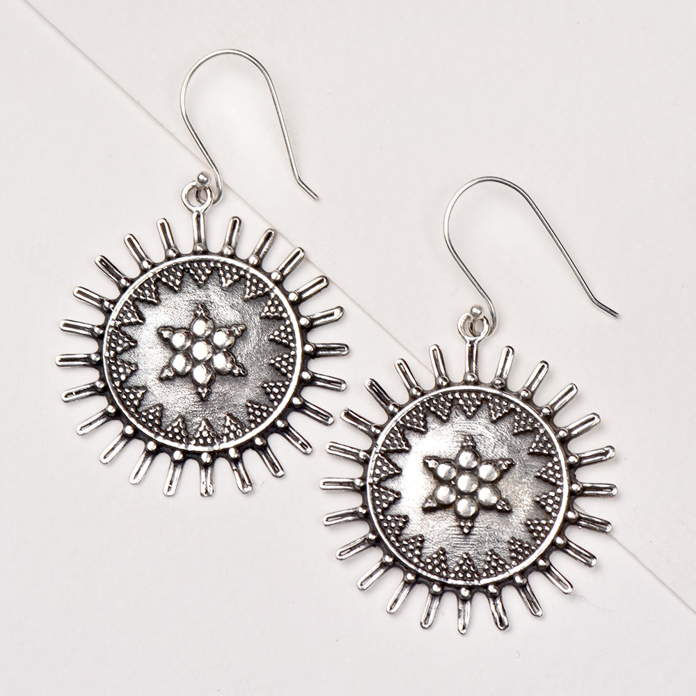 A gorgeous and exquisite designed round Sunflower embossed design drop earrings in oxidized finish is the perfect accessory for party, office and daily wear it will adds style and class when worn during birthdays, marriages , engagement or any other occasion.