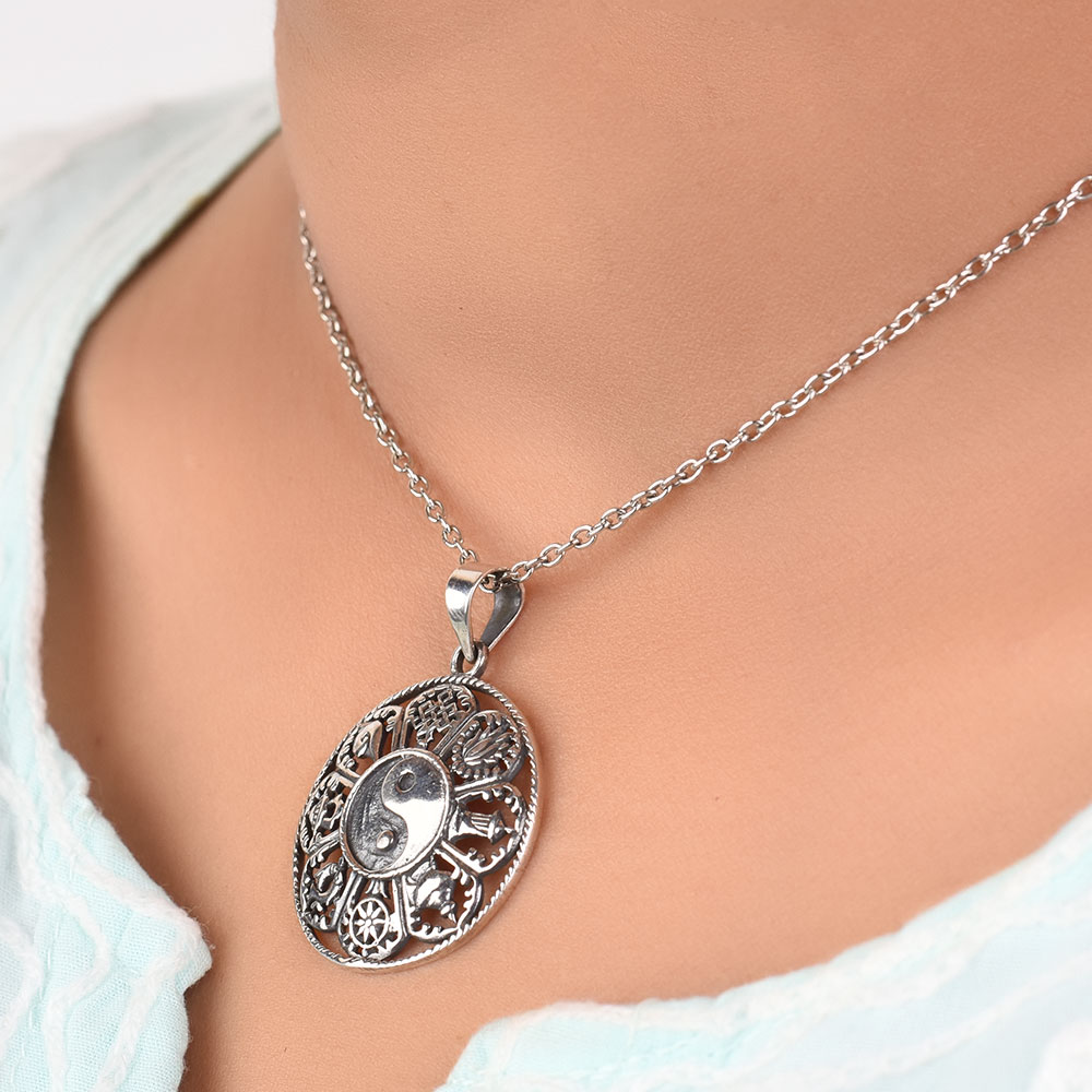 Handcrafted silver (92.5 sterling silver) pendant in a beautifully floral carved design pattern with feng shui symbol in the centre is handcrafted by Indian artisans and goes well with all traditional attire. It’s trendy fusion jewellery that can be worn on wedding, festival, party, and on any occasion.