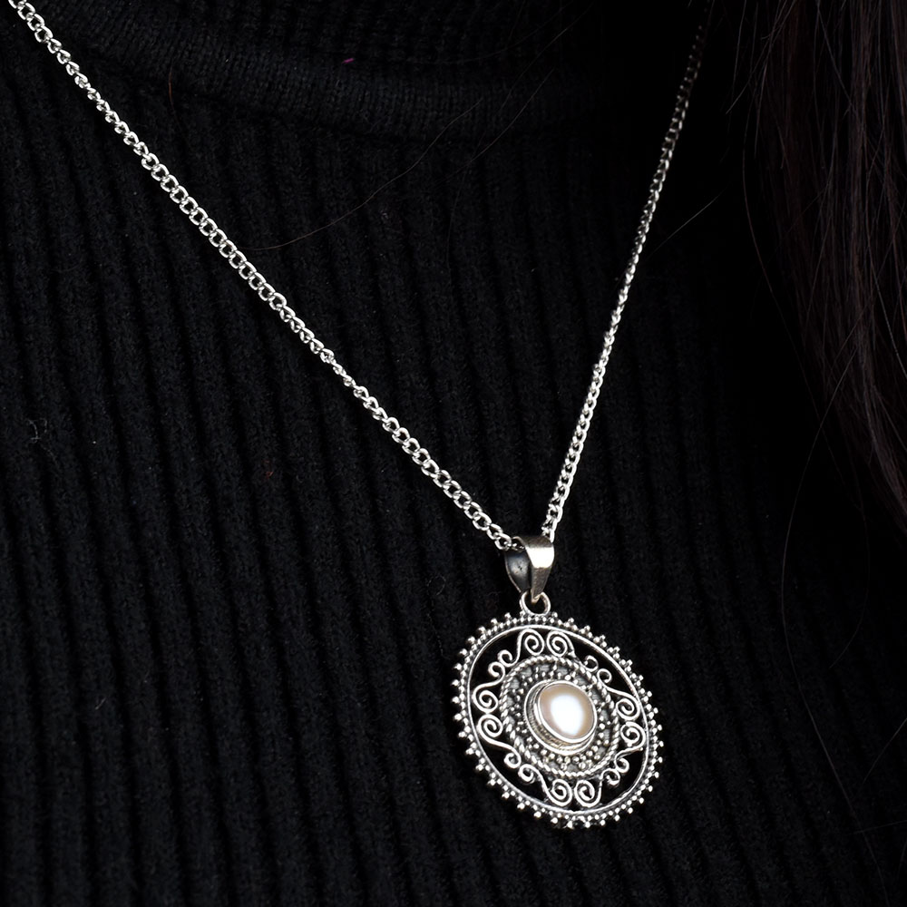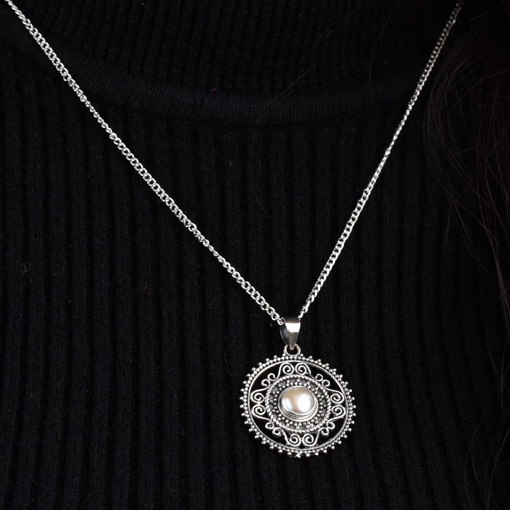92.5 Sterling Silver Pearl in Round Engraved Pendant can be paired with casual, formal or office wear. It can be gifted to friend and relatives on anniversaries, weddings, engagements, birthdays, Formal functions or those special evening where less is more.